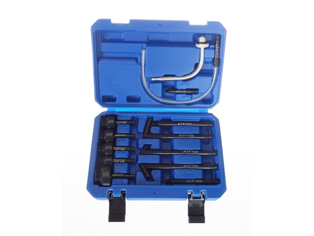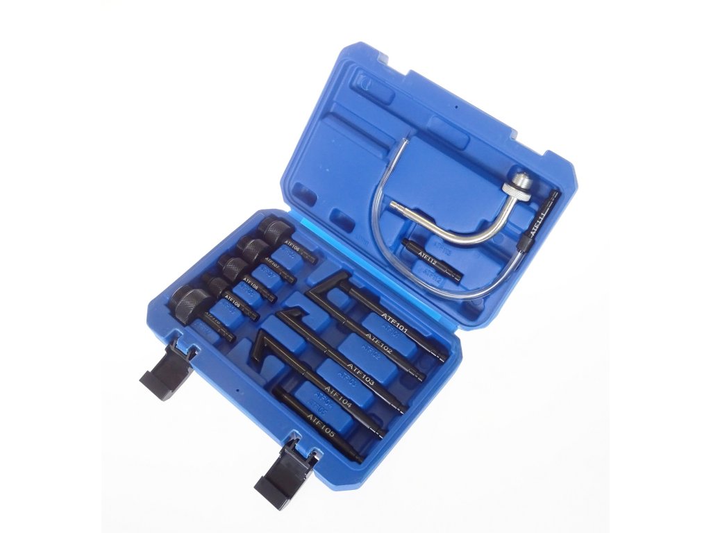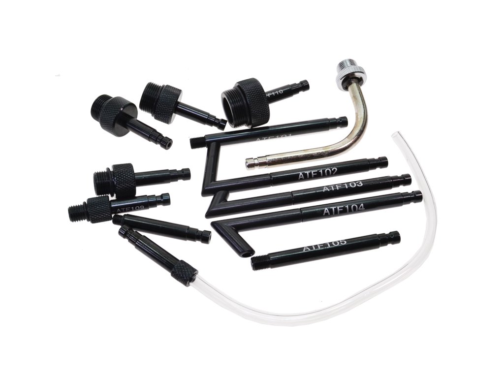 Souprava třinácti různých adaptérů pro připojení plničky převodového oleje (ATF) – např. QUATROS QS60642 – k automatickým převodovkám různých značek.