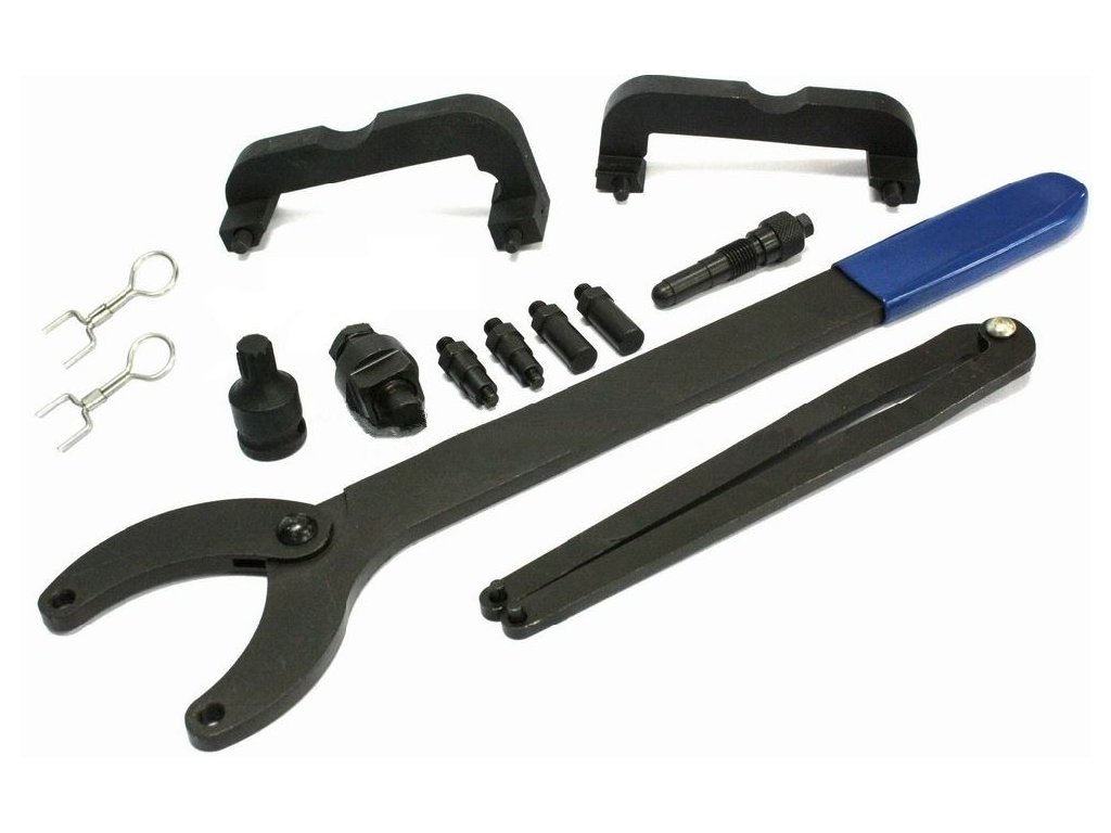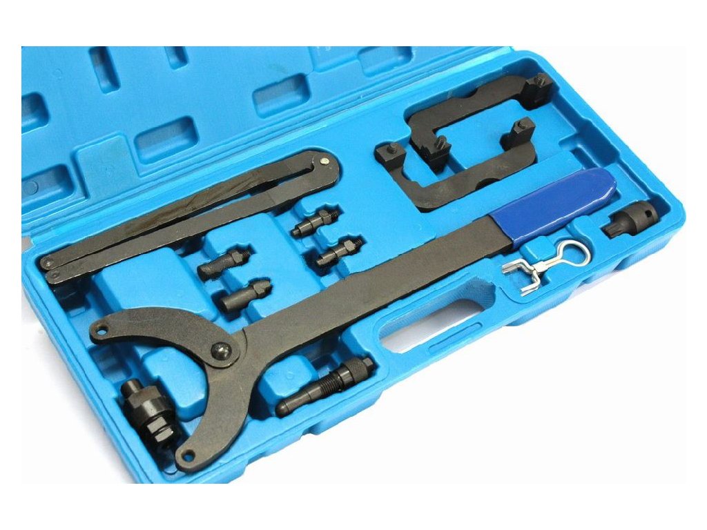 Speciálně navržená sada časovacích nástrojů pro zážehové motory VAG (Audi, Volkswagen) 2.5, 2.8, 3.0, 3.2L a Porsche 3.0L pro zablokování vačkového a klikového hřídele v jejich správné načasované poloze během nastavování nebo výměny řetězu.