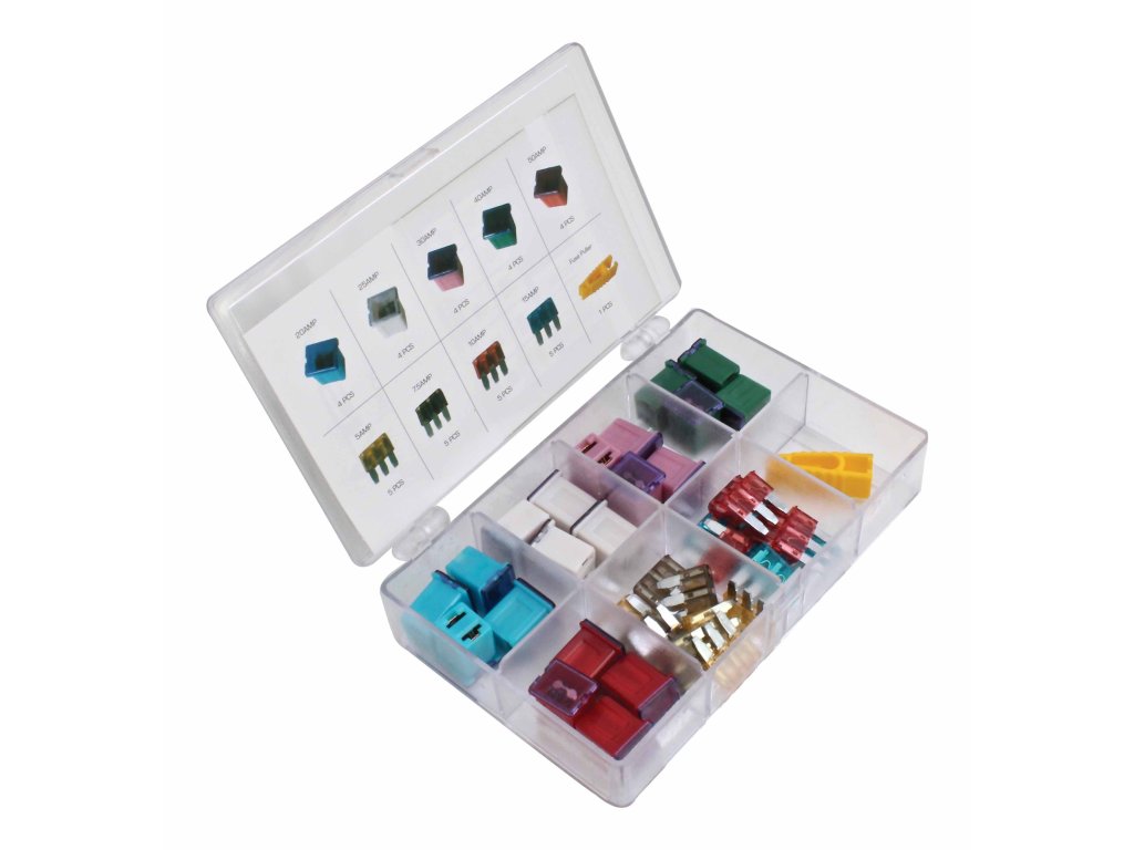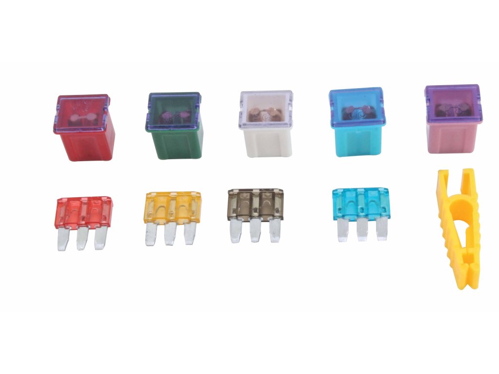 Komplexní souprava autopojistek pro moderní stroje. Obsahuje také pracovní kleštičky, pomocí kterých lze pojistky instalovat nebo vytahovat z pojistkové skříně.