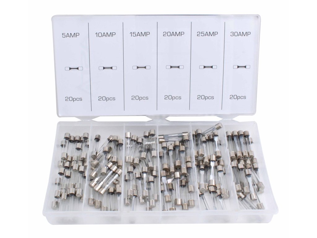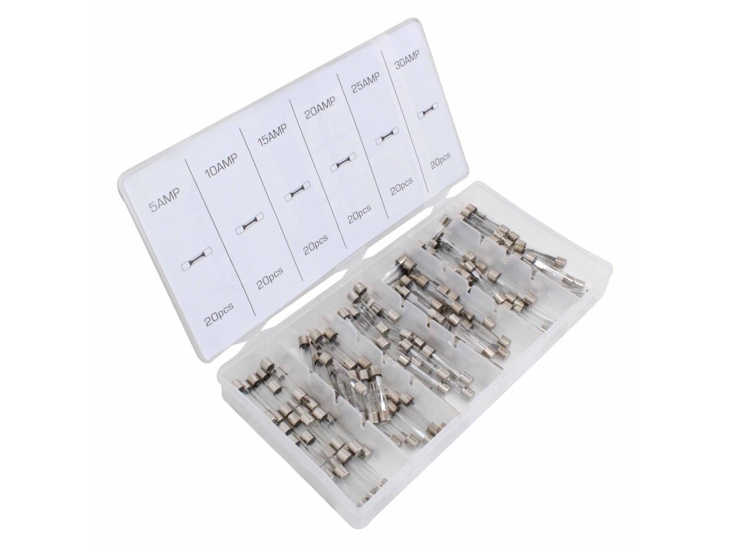 Pojistky skleněné trubičkové, pro palubní elektroinstalaci aut, sada 120 kusů v plastové krabičce – ASTA A-TC519