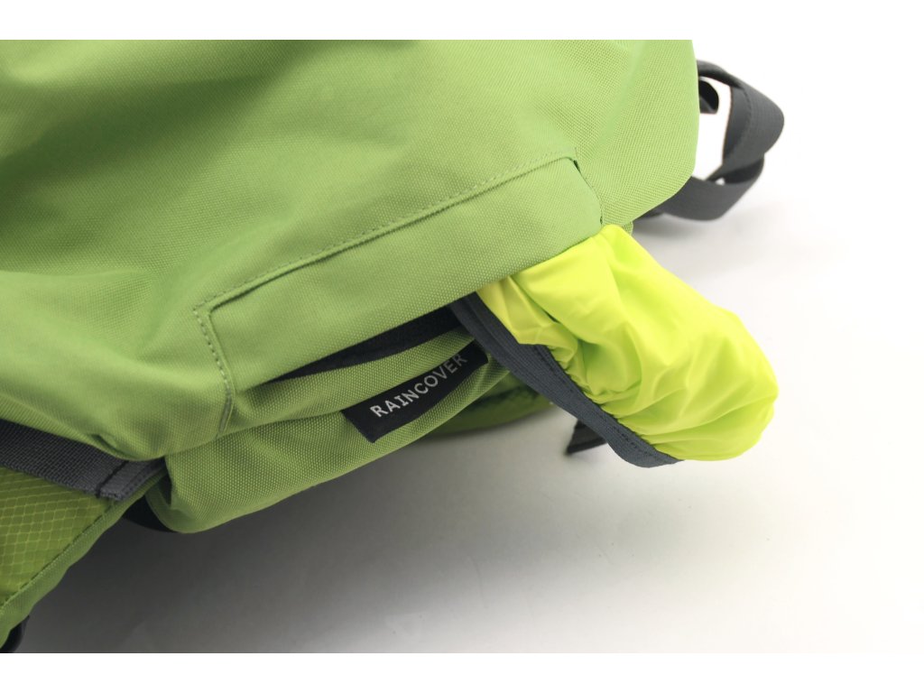 Na spodní straně batohu je kapsa s vestavěnou pláštěnkou, kterou lze v rychlosti zakrýt celý batoh a tím jej chránit před deštěm.