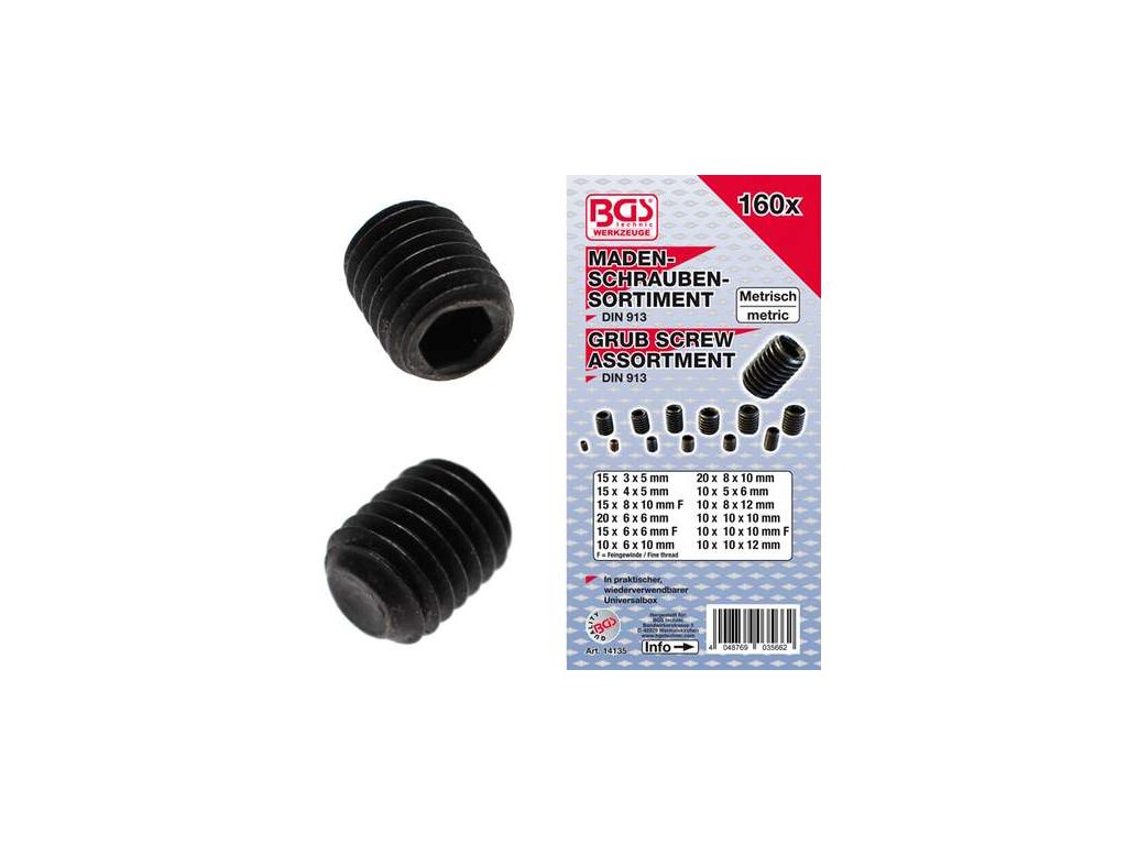 Stavěcí šrouby BGS technic - sortiment 160 ks Vyrobeno z oceli Dle DIN 913 Obal vhodný pro závěs na stěnu Součásti dodávky "červíků" BGS technic Stavěcí šrouby s normálním závitem: 15 stavěcích šroubů M3 x 5 mm 15 stavěcích šroubů M4 x 5 mm 20 stavěcích šroubů M6 x 6 mm 10 stavěcích šroubů M6 x 10 mm 20 stavěcích šroubů M8 x 10 mm 10 stavěcích šroubů M5 x 6 mm 10 stavěcích šroubů M8 x 12 mm 10 stavěcích šroubů M10 x 10 mm 10 stavěcích šroubů M10 x 12 mm Stavěcí šrouby s jemným závitem: 15 stavěcích šroubů M6 x 6 mm 15 stavěcích šroubů M8 x 10 mm 10 stavěcích šroubů M10 x 10 mmDoplňkové parametry