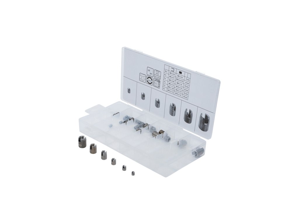 Sada samořezných závitových vložek BGS technic Určeno pro opravu a zmenšení stávajících závitů Provedení s bočním zářezem Vložky si při zašroubování do předvrtaného otvoru vyříznou vlastní závit Absolutně bezpečné a pevné ukotvení v opravovaném materiálu V plastové přehledné kazetě Obal vhodný pro závěs na stěně Součásti dodávky sady závitových vložek závitové vložky - vnitřní závit M3 x 0,5, vnější závit M5 x 0,6, délka: 6 mm (10 ks) závitové vložky - vnitřní závit M4 x 0,7, vnější závit M6,5 x 0,8, délka: 8 mm (8 ks) závitové vložky - vnitřní závit M5 x 0,8, vnější závit M8 x 1,0, délka: 10 mm (6 ks) závitové vložky - vnitřní závit M6 x 1,0, vnější závit M10 x 1,25, délka: 12 mm (4 ks) závitové vložky - vnitřní závit M8 x 1,25, vnější závit M12 x 1,5, délka: 14 mm (2 ks) závitové vložky - vnitřní závit M10 x 1,5, vnější závit M14 x 1,5, délka: 18 mm (2 ks)Doplňkové parametry