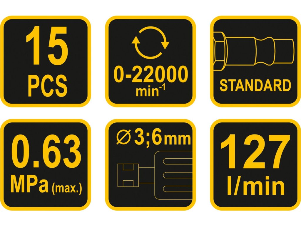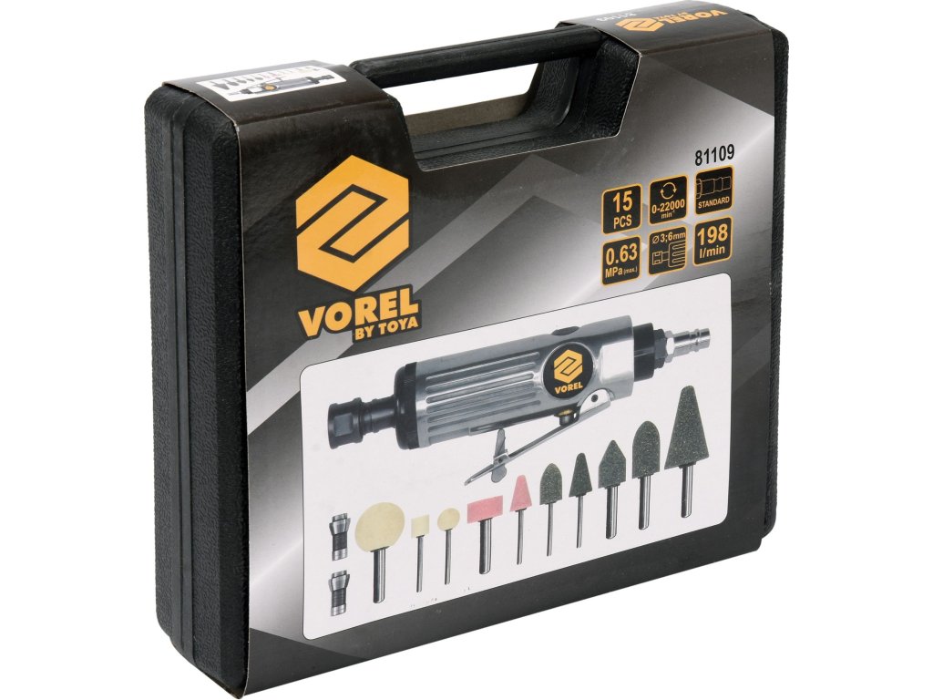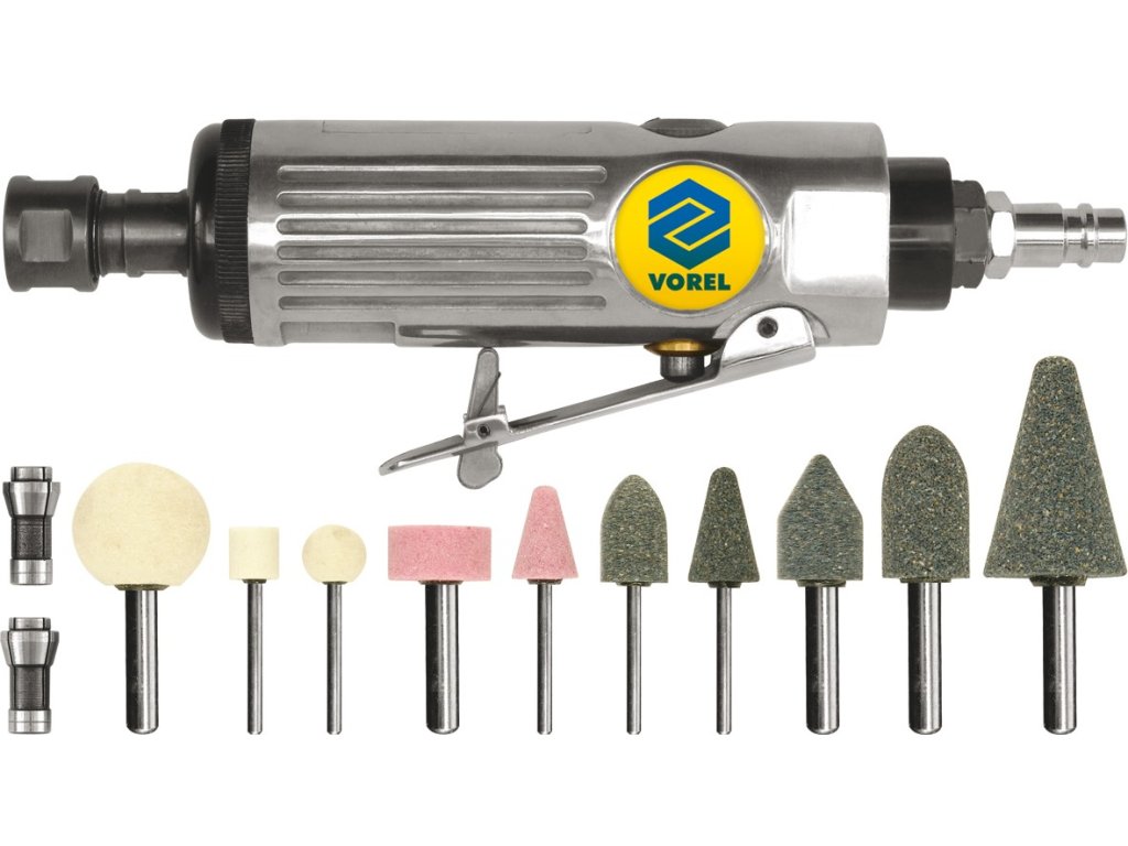 Sada pneumatické přímé brusky k připojení řezných a brusných nástrojů se stopkou průměru 6 mm.