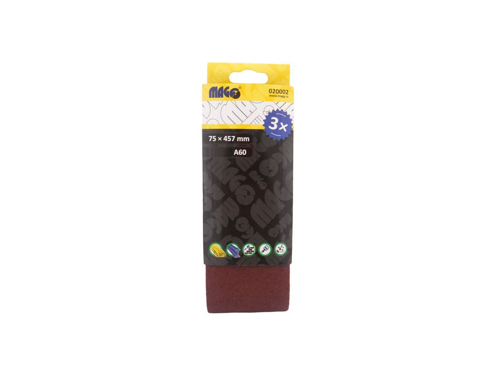Brusné papírové pásy – smirek, pro pásovou brusku, značky MAGG Různé zrnitosti (hrubosti): varianty s nižšími čísly jsou vhodné k hrubému broušení (mají velký úběr materiálu), vyšší čísla jsou určena pro jemnější broušení. Rozměr pásů: 75 x 457 mm Balení obsahuje 3 kusy.Doplňkové parametry