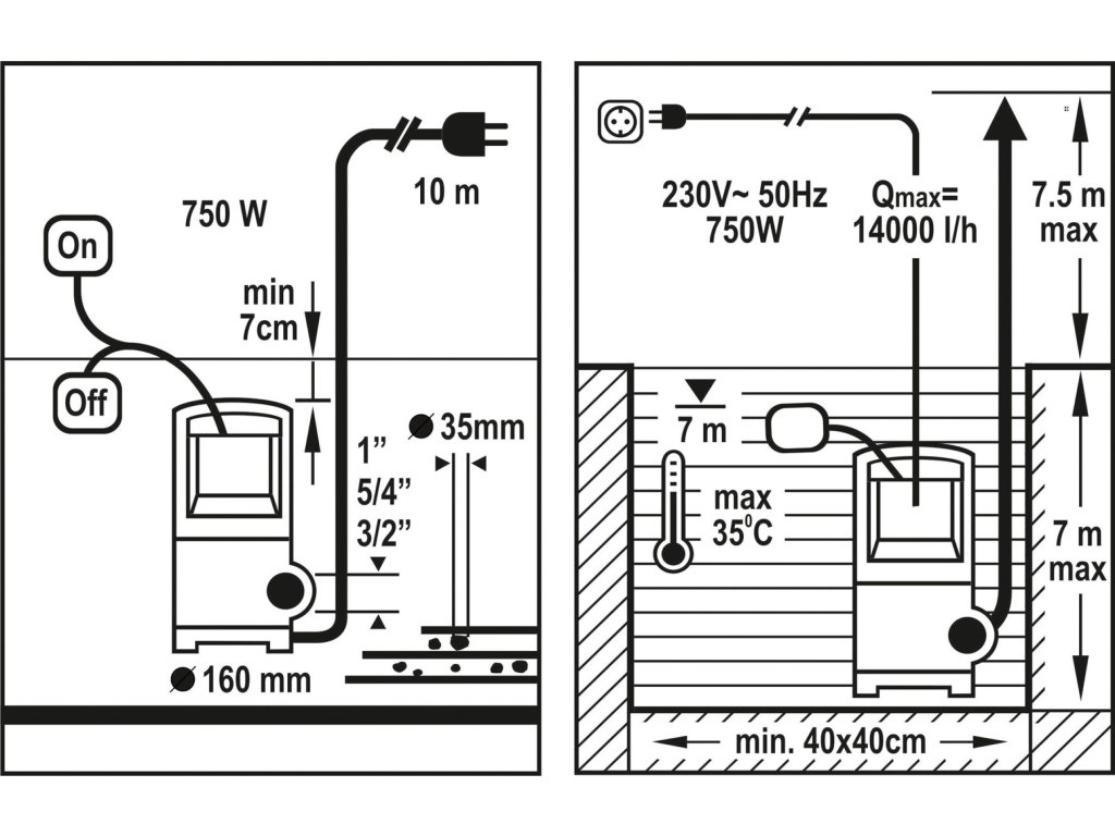 Tělo čerpadla je vyrobeno z vysoce odolného plastu, dále je vybaveno plovákovým spínačem, který zabraňuje provozu čerpadla "na sucho". Pro připojení do sítě, je čerpadlo opatřeno kabelem délky 10 m.