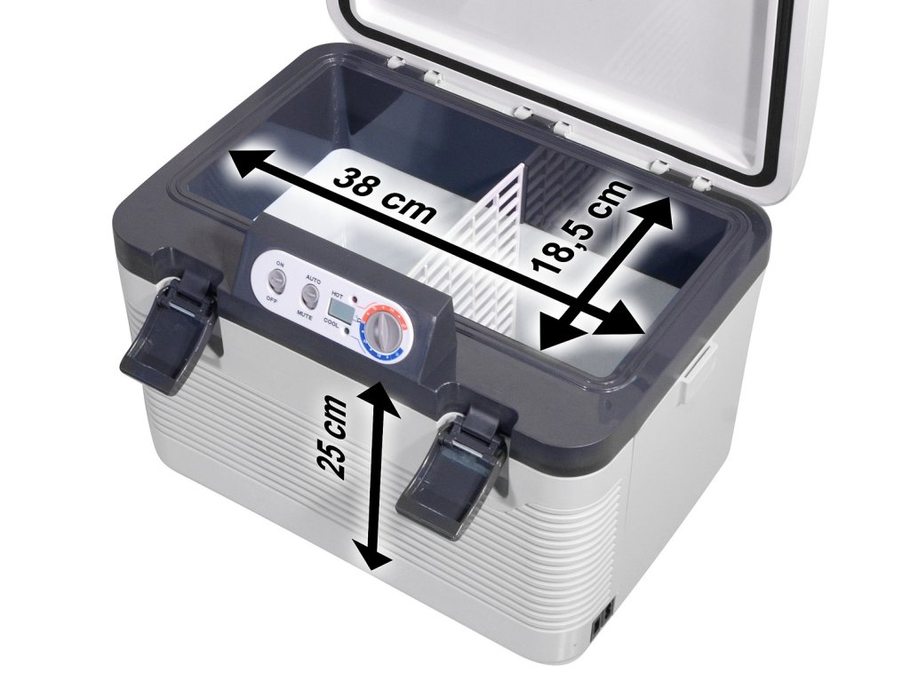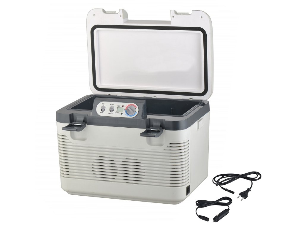 Přenosný chladicí box s možností ohřevu, napájení ze zásuvky autozapalovače 12 V nebo 24 V a také z běžné zásuvky 230 V, vnitřní objem 19 litrů. Ideální společník na cesty, na dovolenou, na piknik, nebo i na nákupy.