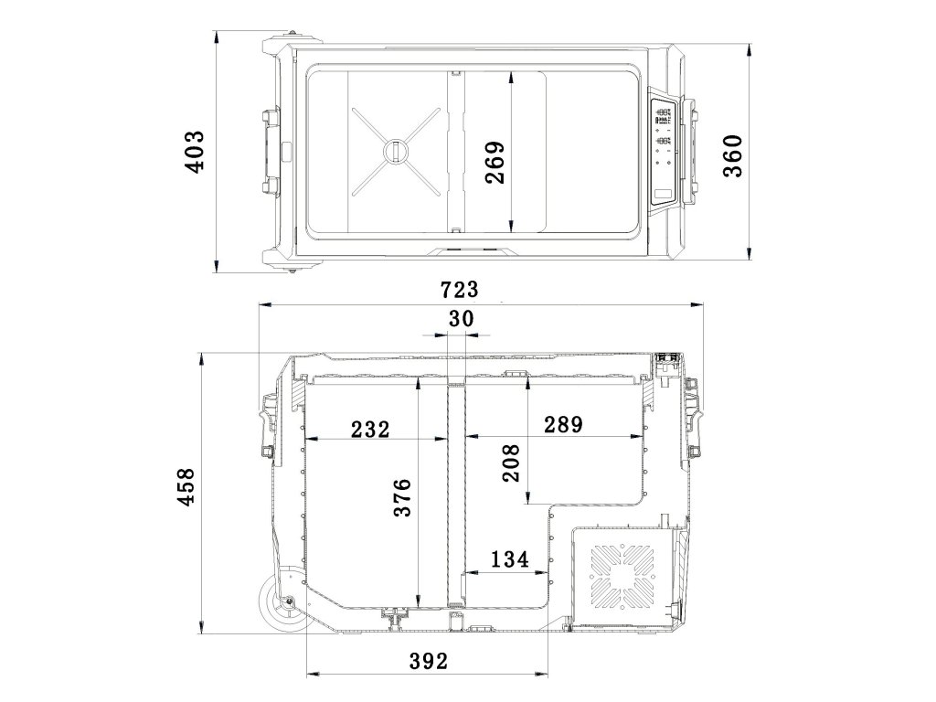 Vnitřní prostor boxu je rozdělen do dvou částí s možností rozdílného nastavení teplot, nebo lze vyjmout dělící příčku a využít tak celý prostor jako jeden. Díky tomu je možné rozložení potravin a nápojů podle požadavků na optimální chlazení. Vnitřní prostor boxu je dále opatřen LED osvětlením. Madla na vnější straně boxu z odolného plastu společně s gumovými kolečky zajišťují výtečnou mobilitu zařízení.
