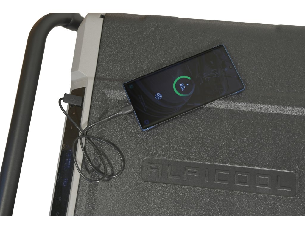 Vnější plášť je proveden z odolného plastu šedočerné barvy, který spolu s perfektní PU izolací zajišťuje dlouhodobé zachování stabilní teploty uvnitř boxu a zaručuje velmi nízkou spotřebu energie. Okraj ovládacího panelu je doplněn o krytou USB zásuvku pro napájení zařízení s USB konektorem. Navíc je chladící box opatřen madlem a kolečky pro usnadněný přesun.