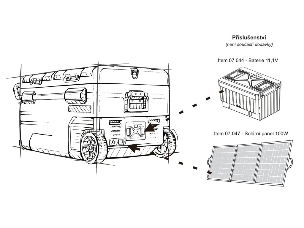 Chladicí box může být napájen z 12 V, nebo 24 V zástrčky automobilů či lodí, nebo z běžné zásuvky 230 V. Je rovněž možné box napájet pomocí Akumulátoru 07044, který lze dobíjet pomocí solárního panelu 07047.
