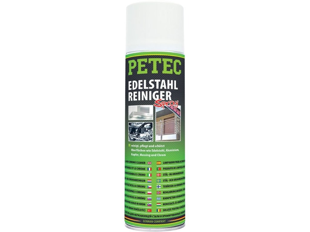 Prostředek ve spreji pro snadné a rychlé čištění a zároveň na ošetření povrchu nerezových ocelí, hliníku, mědi, mosazi, chromu atd. v rámci jednoho nástřiku, sprej 500 ml – Petec 70260