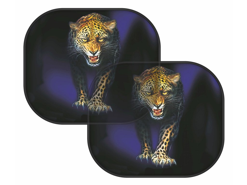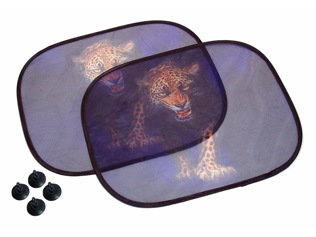 Sada 2 kusů slunečních clon s přísavkami na okna automobilu. Způsob perforace materiálu zajišťuje absorpci cca 70% slunečních paprsků. Po použití lze clonu pohodlně složit zpět do obalu. Tvar clony - ovál, potisk motiv Leopard.