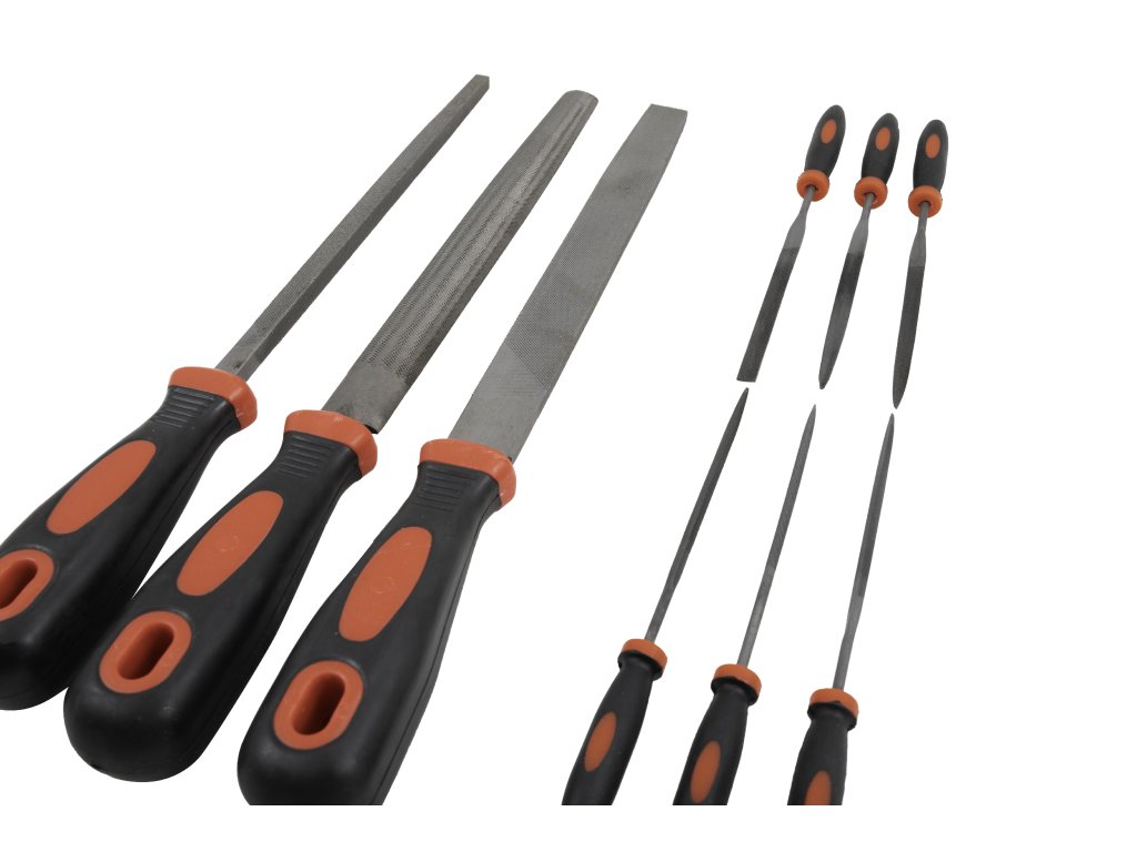 6x pilník 14 cm: kruhový, plochý, plochý se špicí, tříhranný, čtyřhranný, jehlový