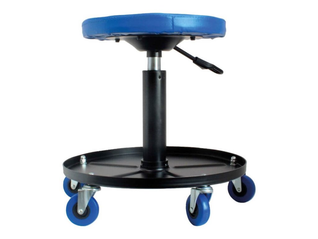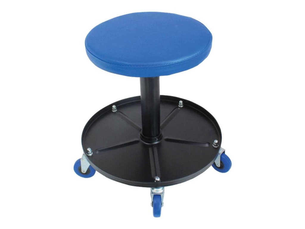 Praktické „štokrle“ pro autoservis, dílnu a mnohá další místa. Díky 5 gumovým kolečkům průměru 60 mm je skvěle pohyblivé ve všech směrech a je vysoce stabilní. Sedátko je polstrované a potažené omyvatelným potahem, jeho výšku lze nastavit podle momentální potřeby (455 – 555 mm od země).
