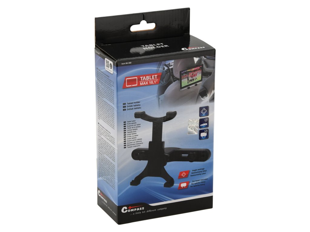 Držák pro tablet s mechanizmem pro upevnění na opěrku hlavy.