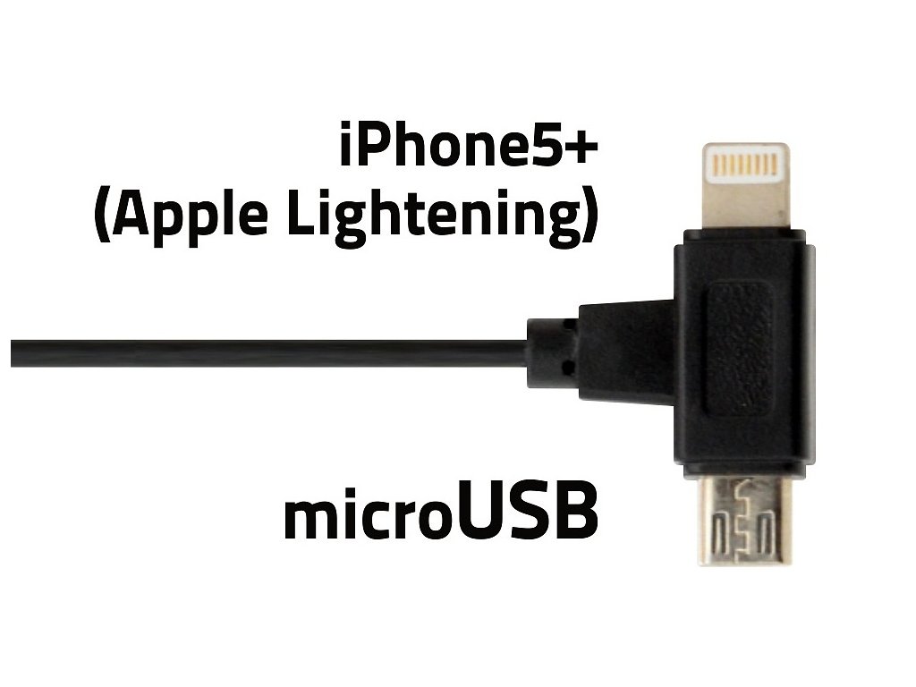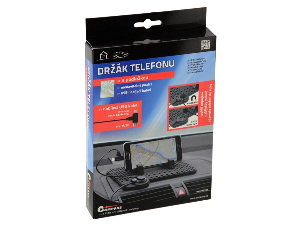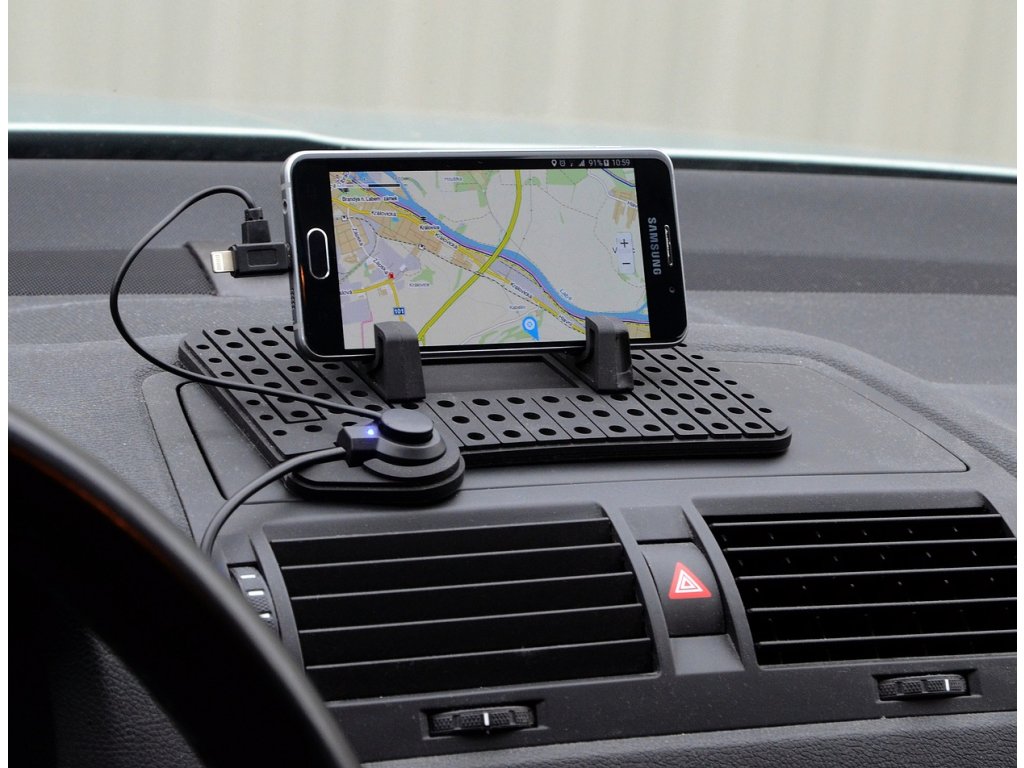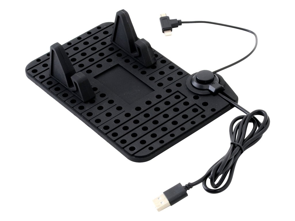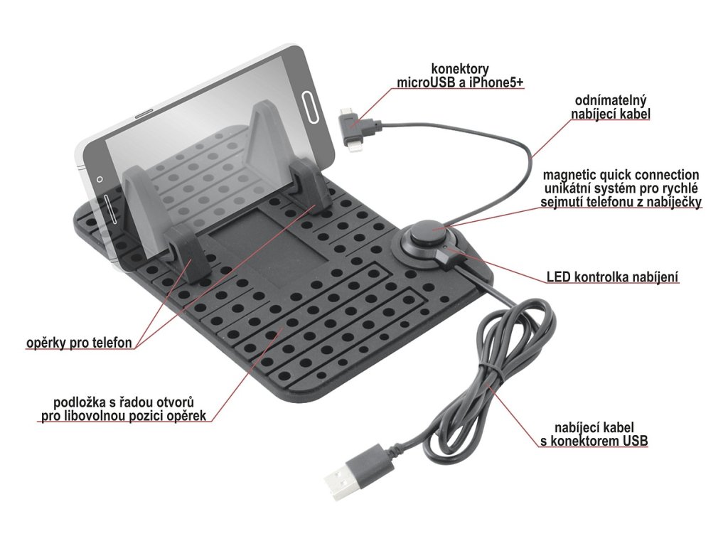 Podložka s držákem na telefon, vybavená nabíjecím USB kabelem s konektorem pro iPhone 5 a vyšší a zároveň s konektorem microUSB pro telefony Samsung, HTC, Huawei, Lenovo a dalších.