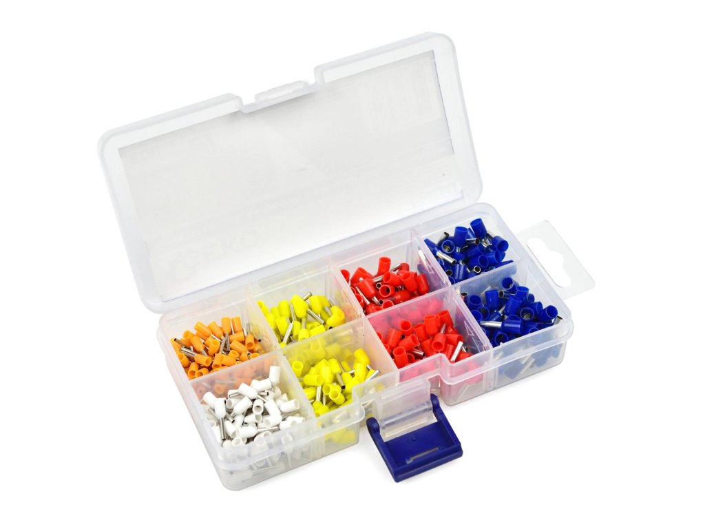 Krimpovací dutinové konektory (tzv. dutinky) pro elektroinstalace, 5 různých průřezů (jednotná délka 8 mm), sada 500 kusů v plastové krabičce – GEKO G03614