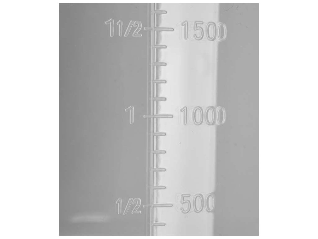 Obsah je jasně vidět skrz stěny, které jsou průhledné. Na druhé straně reliéfní stupnice, vyjádřená v litrech a mililitrech, vám umožňuje změřit požadované množství produktu.