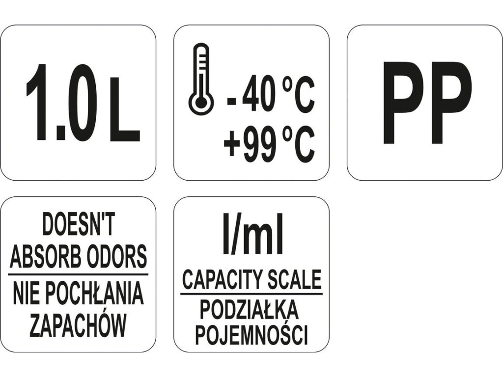 Džbán s odměrkou od YATO je vyroben z pružného a odolného polypropylenu, který neabsorbuje pachy ani příchutě. Navíc mají pohodlnou, vyztuženou rukojeť. Díky tomu jsou velmi praktické a univerzální pro měření tekutých a sypkých produktů v teplotním rozsahu -40° C až +99° C.