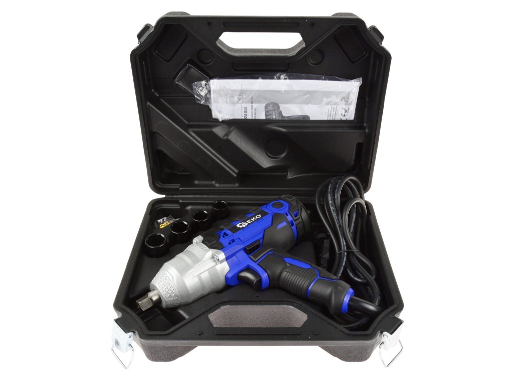 Elektrický rázový utahovák 1/2“ (tzv. rázová utahovačka) GEKO G81053 Utahovák pro pneuservisy, autoservisy a další provozovny. Vhodný i pro domácí použití – díky elektrickému pohonu nepotřebuje stlačený vzduch z kompresoru. Díky vysokému točivému momentu 720 Nm a rychlosti až 3600 otáček za minutu bohatě zastane většinu prací. Přepínání směru otáčení vlevo a vpravo umožňuje klíč používat k utahování i povolování. Dodáván s hlavicemi rozměrů 17, 19, 21, 22 mm, vyrobenými z chrom-vanadové oceli. Technická data: Napájení: 230V / 50Hz Výkon: 450W Rychlost: 3600 ot./min Maximální točivý moment: 720 Nm Velikost čtyřhranu: 1/2“ Otáčení: doleva / doprava Hlavice v sadě: 17, 19, 21, 22 mm Třída ochrany: II Souprava je dodávána v praktickém kufříku z tvrdého plastu. Nástroj je díky tomu možné snadno skladovat a přenášet.Doplňkové parametry