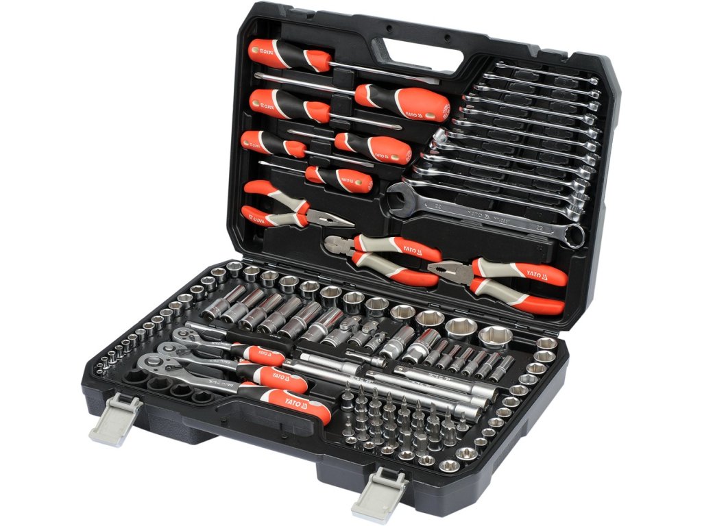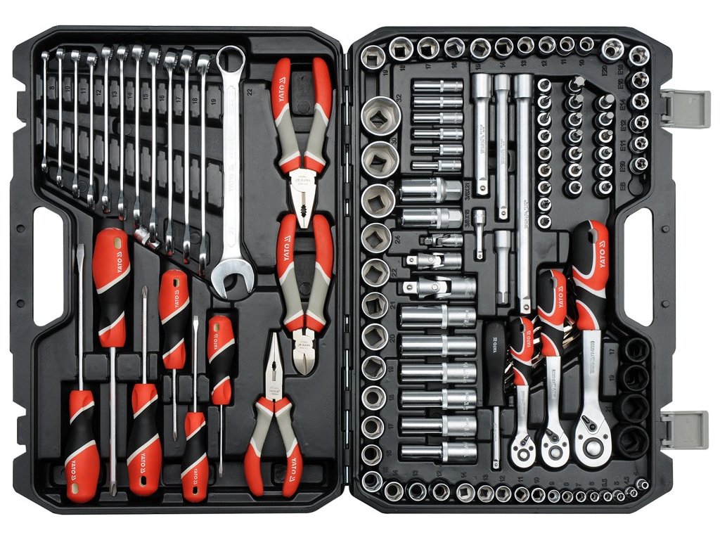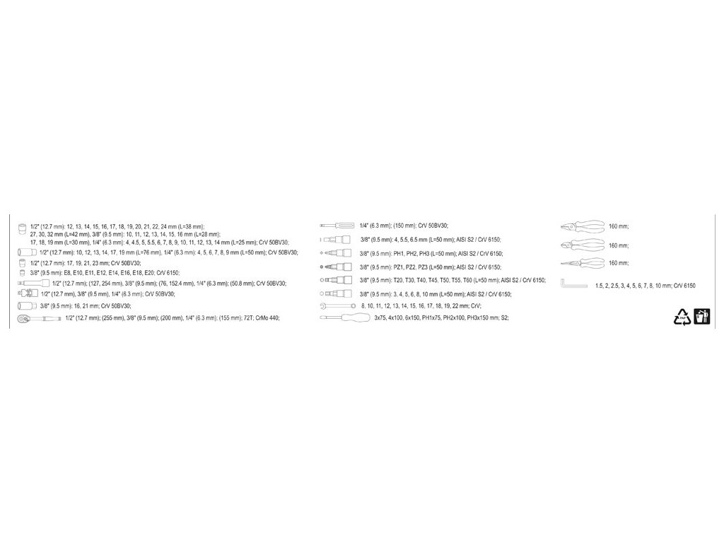 Gola sada 1/2", 3/8", 1/4" obsahuje 129ks: nástavců, prodlužovacích nástavců, ráčny s plastovou rukojetí a 72 zubým jemným chodem, kloubové nástavce, očkoploché klíče a další příslušenství. Vyrobené z kvalitní chromvanadiové oceli CrMo440, CrV6140 a CrV50BV30, S2 s funkcí AS-DRIVE.