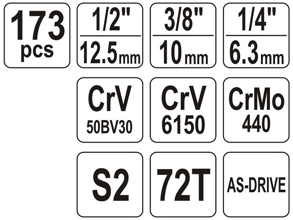 Gola sada 1/2", 3/8", 1/4" obsahuje 173ks: nástavců, prodlužovacích nástavců, ráčny s plastovou rukojetí a 72 zubým jemným chodem, kloubové nástavce a další příslušenství. Vyrobené z kvalitní chromvanadiové oceli CrMo440, CrV6150 a CrV50BV30, S2 s funkcí AS-DRIVE.