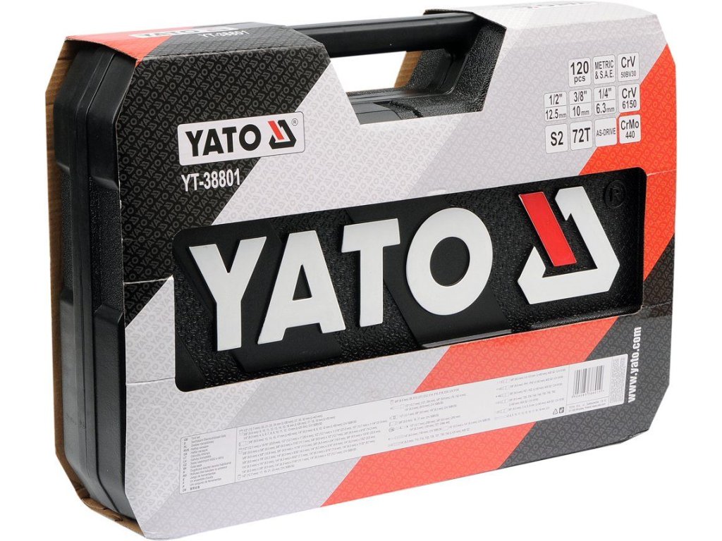 Gola sada 1/2", 3/8", 1/4" obsahuje 120ks: metrických a S.A.E. nástavců, prodlužovacích nástavců, ráčny s plastovou rukojetí a 72 zubým jemným chodem, kloubové nástavce, očkoploché klíče, nástavce s nejběžněji používanými bity a další příslušenství. Vyrobené z kvalitní chromvanadiové oceli CrMo440, CrV6150 a CrV50BV30, S2 s funkcí AS-DRIVE.