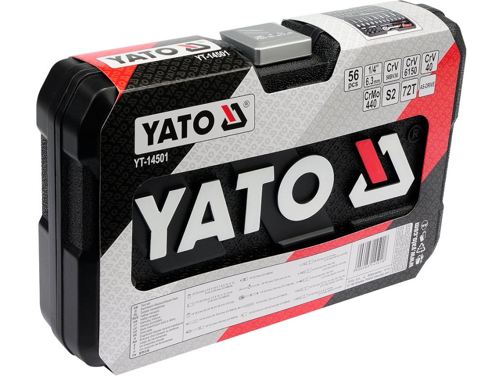 Gola sada 1/4" obsahuje 56ks: nástavců, prodlužovacích nástavců, ráčnu s plastovou rukojetí a další příslušenství. Vyrobené z kvalitní oceli CrV50BV30, CrV40, CrV6150, CrMo440 a S2 s funkcí AS-DRIVE. Ráčna má jemný 72 zubý chod.