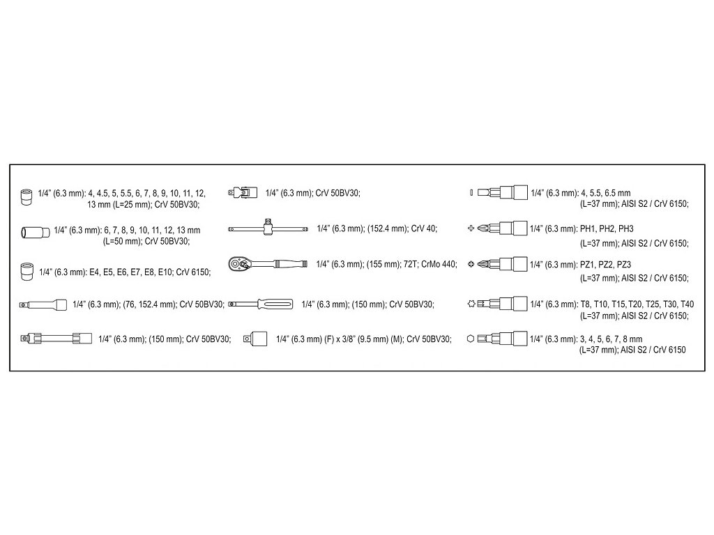 | 12x | nástavec 1/4": 4; 4.5; 5; 5.5; 6; 7; 8; 9; 10; 11; 12, 13 mm (L= 25 mm) |