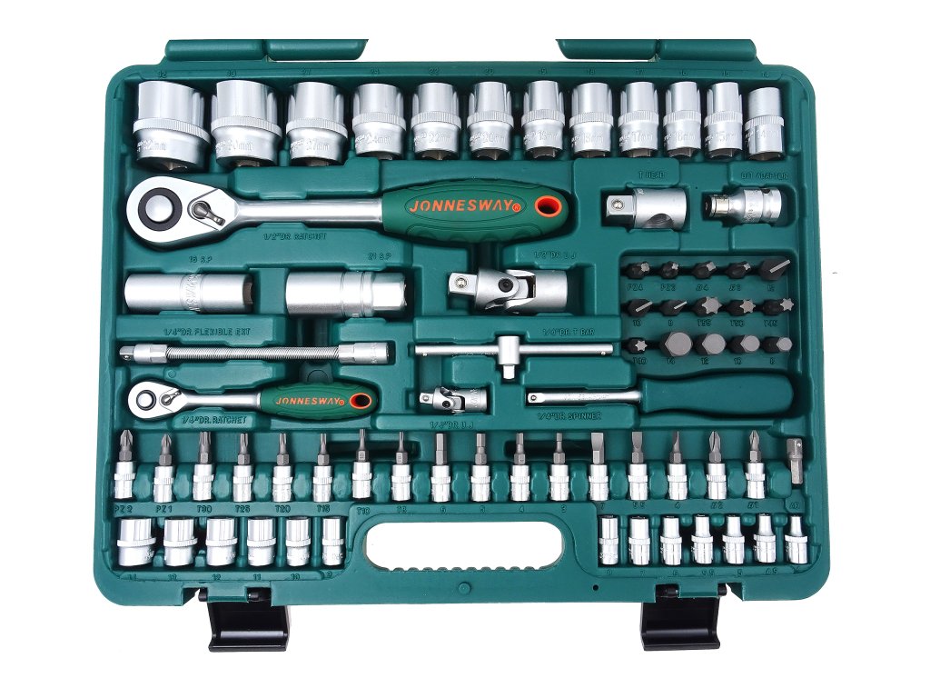 Kombinovaná gola sada s nářadím 1/4” a 1/2” a očkoplochými klíči, 82 kusů nářadí, v plastovém kufru – JONNESWAY S04H52482S