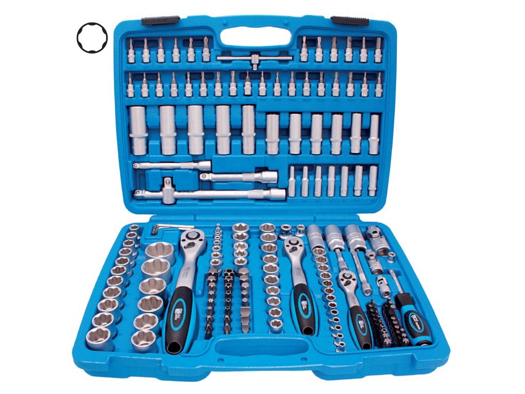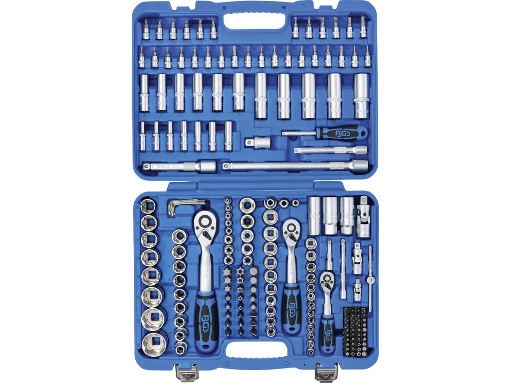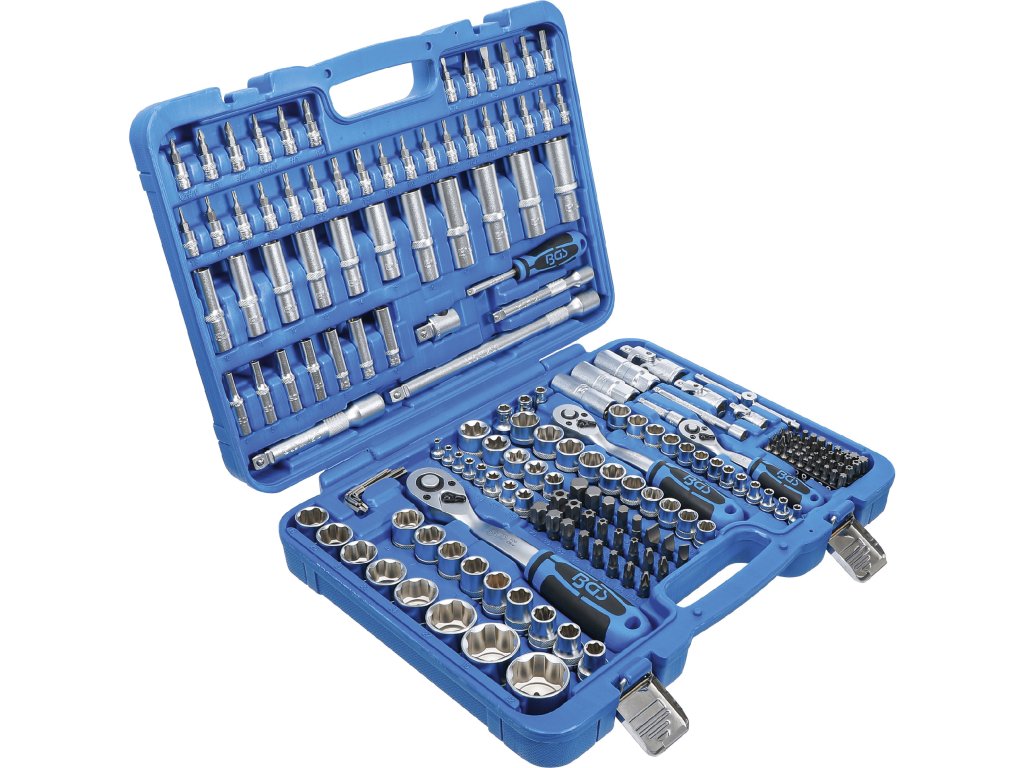 Gola sada s nářadím v metrických rozměrech, vodicí čtyřhrany 1/4“, 3/8“ a 1/2“, extra rozsah 192 dílů v plastovém kufru s kovovými přezkami – BGS technic 2292.