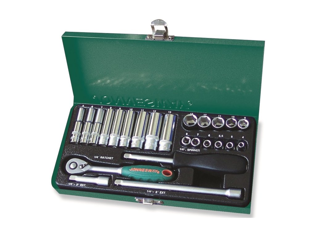 Gola sada s nářadím v metrických rozměrech, vodicí 4hran 1/4“, 25dílů v plechové kazetě – JONNESWAY S04H2125S
