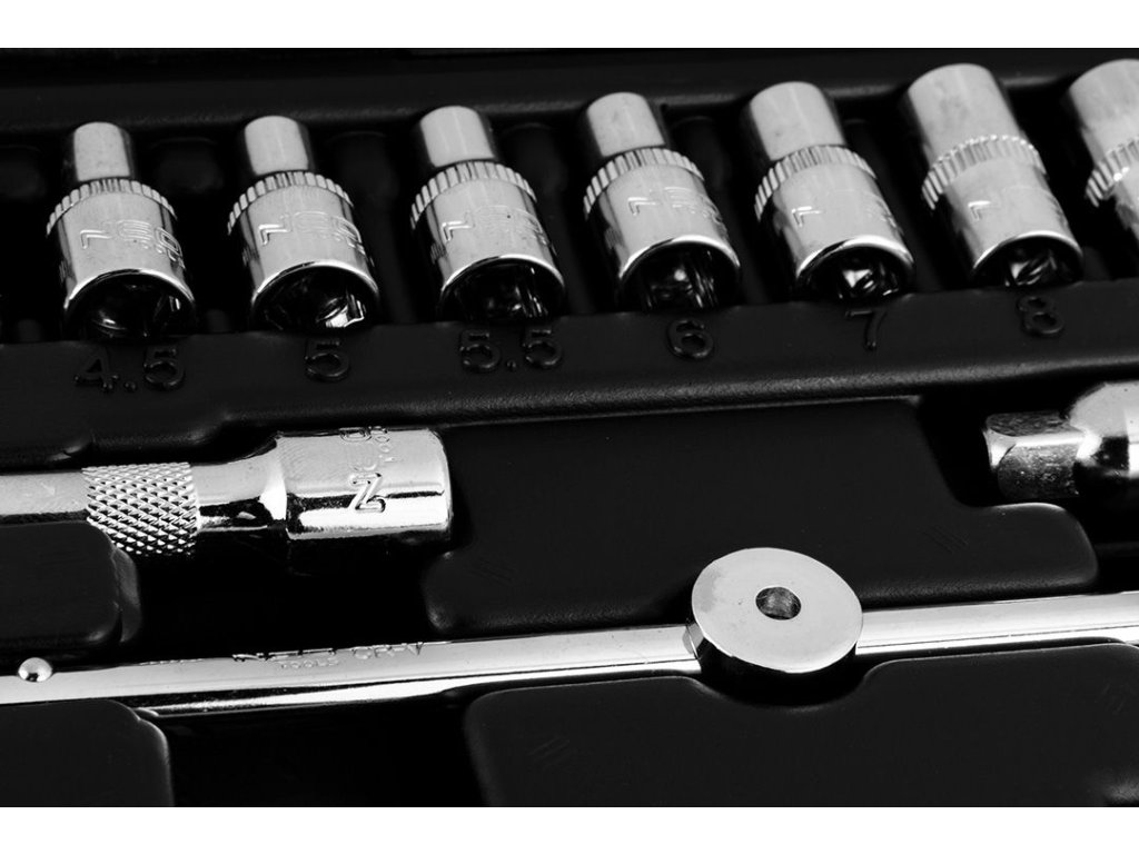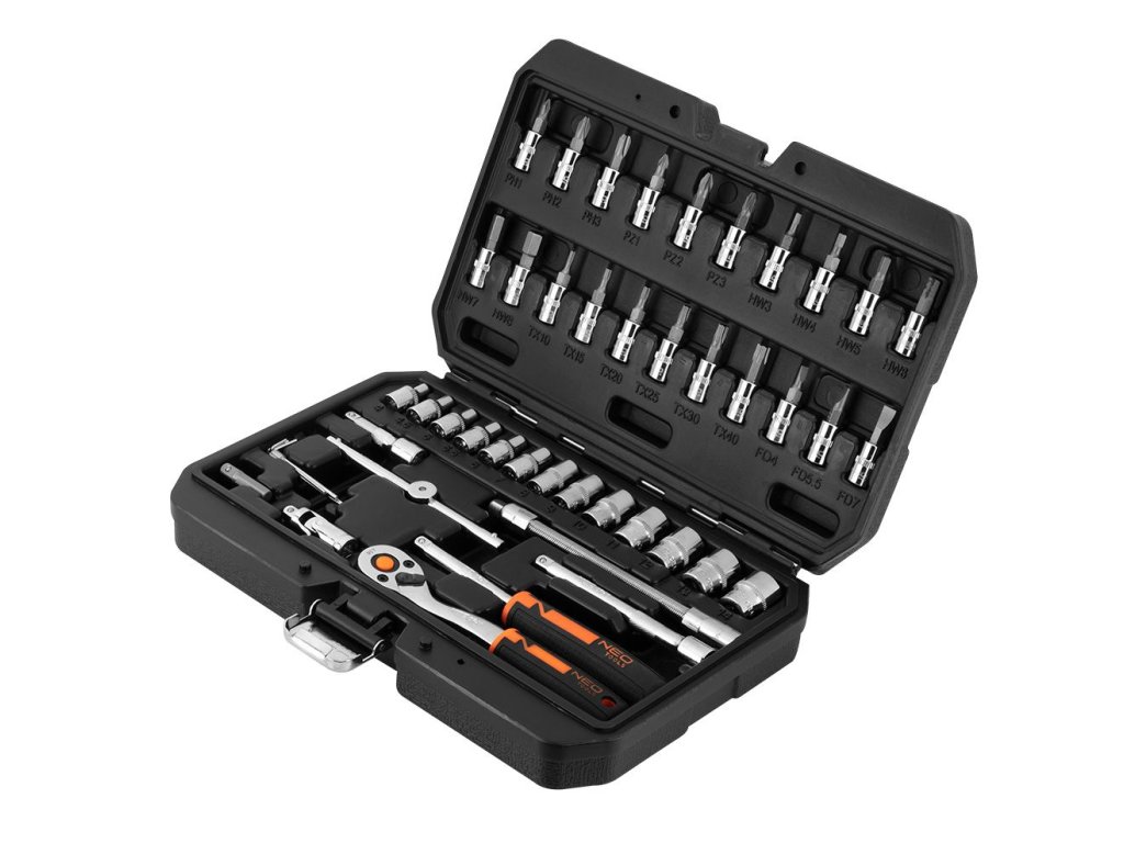 Gola sada 1/4", přesná ráčna s 90 zuby, nový patentovaný design rukojeti, 25 let záruka, 46 ks – NEO tools 10-004