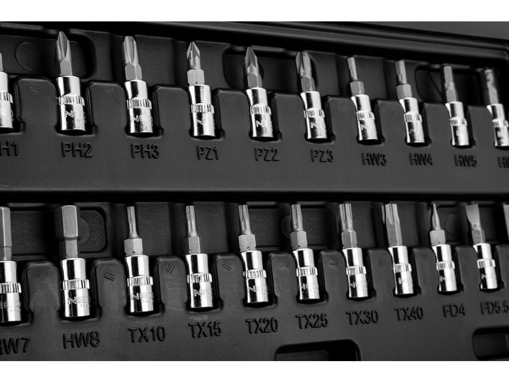 • 1/4“ zástrčné hlavice: SL4, SL5.5, SL7, PH1, PH2, PH3, PZ1, PZ2, PZ3, TX10, TX15, TX20, TX25, TX30, TX40, HEX3, HEX4, HEX5, HEX6, HEX7, HEX8