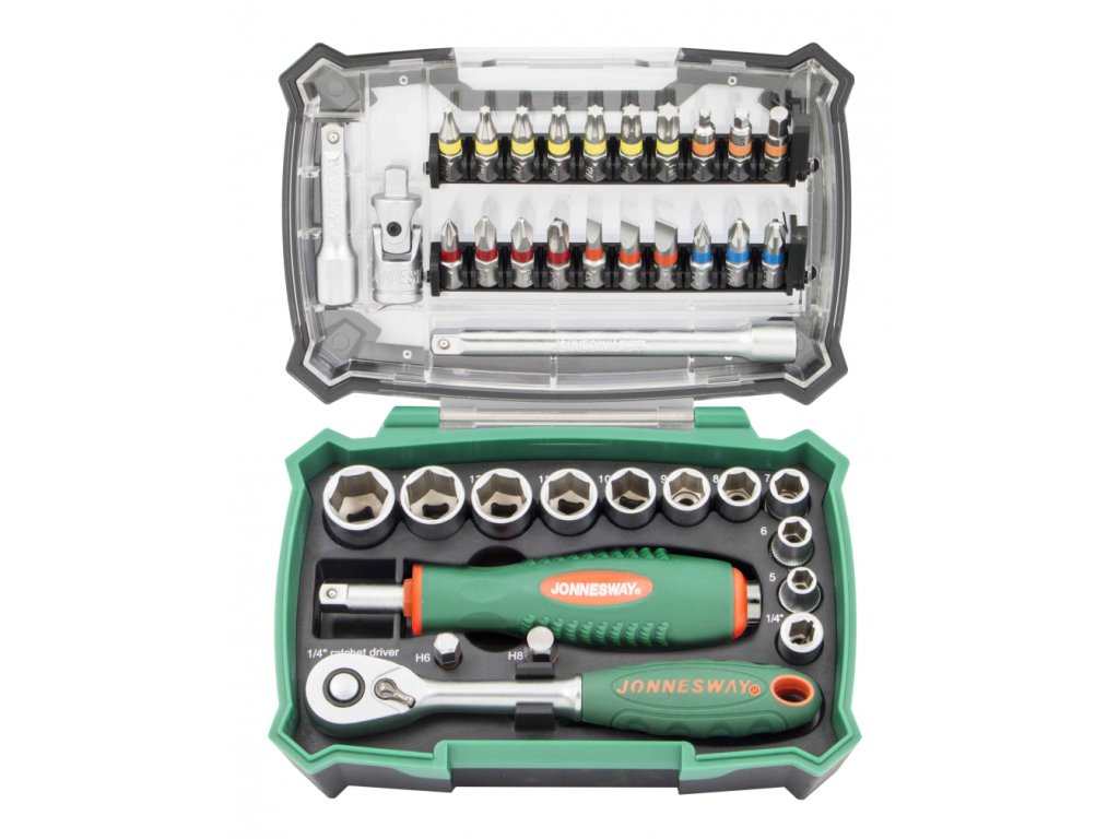 Gola sada 1/4“ v metrických rozměrech, s ráčnou, bity a držákem, 38 dílů v plastové kazetě – JONNESWAY RD0638S