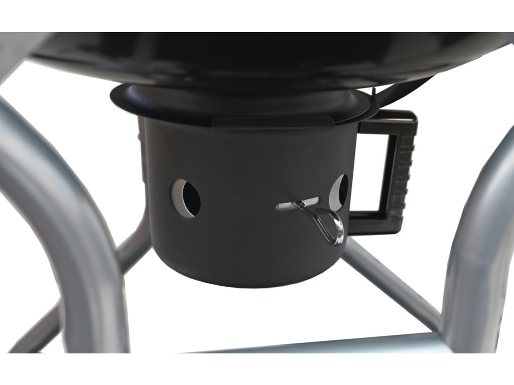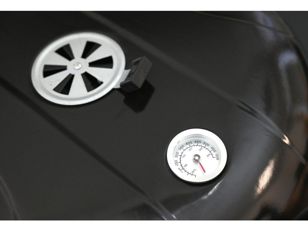 Vyklápěcí víko je tvarováno z nerezové oceli se smaltovaným povrchem, je opatřené teploměrem a regulací ventilace. Madlo na víku je plastové a má dostatečný prostor pro úchop. Ve spodní části je grilovací prostor opatřen vysouvacím popelníkem s nastavitelným prouděním vzduchu.