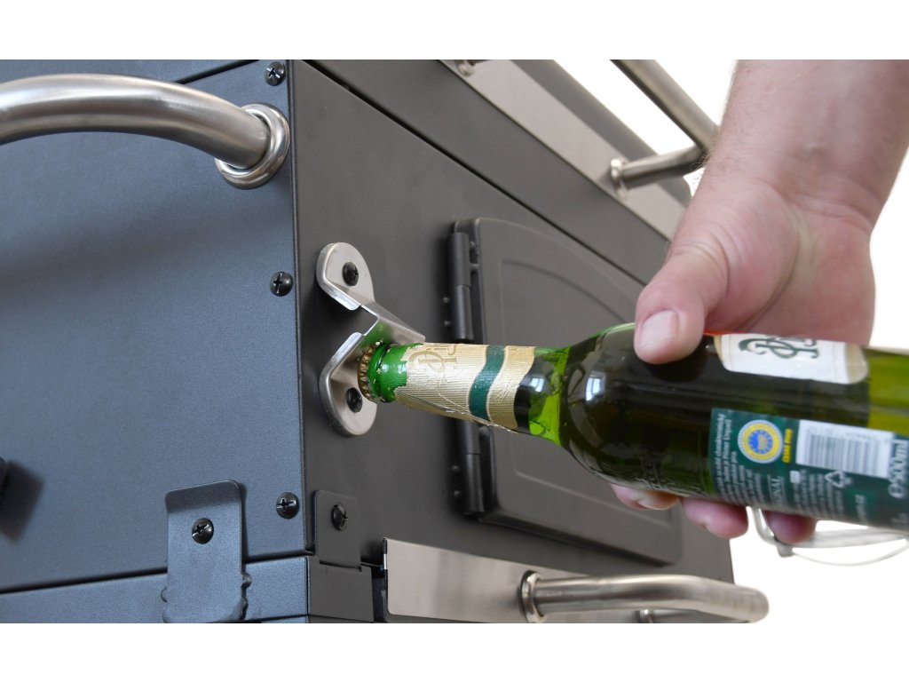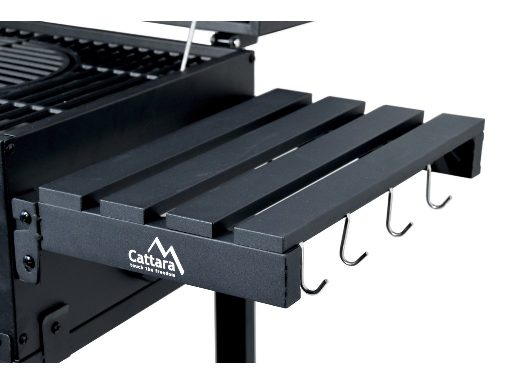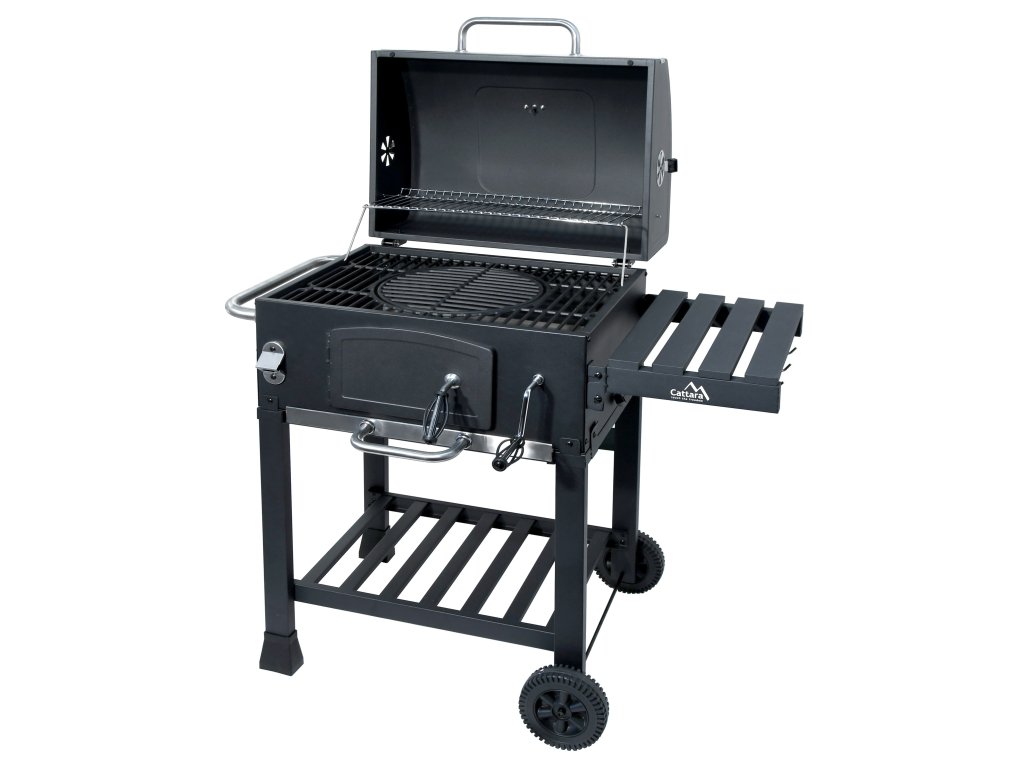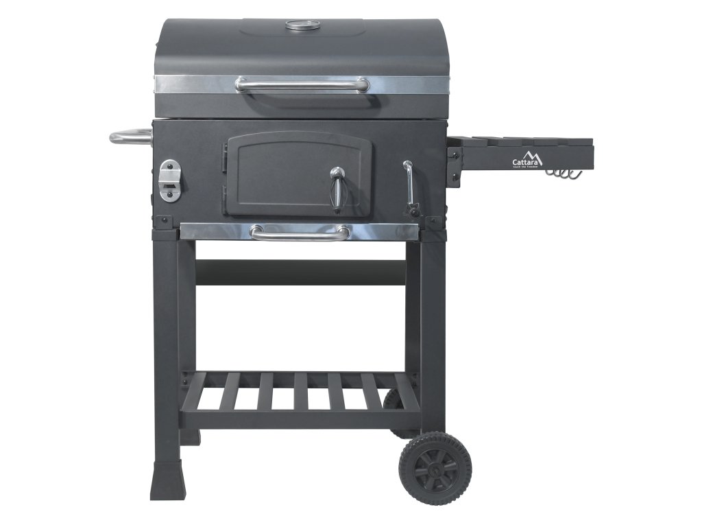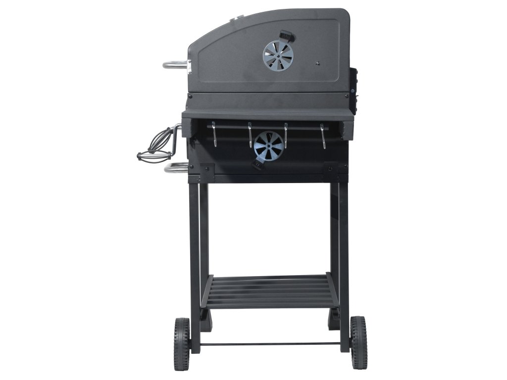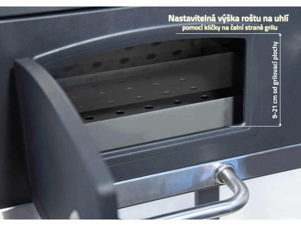 Konstrukce z oceli je opatřena hrubou černou barvou. Madla a ovládací kovové prvky, mají dostatečné rozměry pro pohodlný úchop a zajišťují precizní ovládání. Oboustranná regulace ventilace perfektně lícuje s konstrukcí. Další předností je rošt na uhlí s nastavitelnou výškou 9-21 cm od grilovacího prostoru, pomocí kličky na přední straně. Dvířka na čelní straně grilu usnadňují doplňování uhlí.