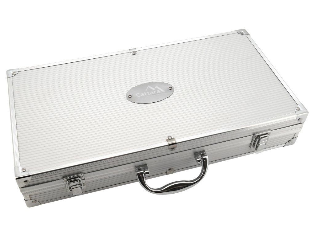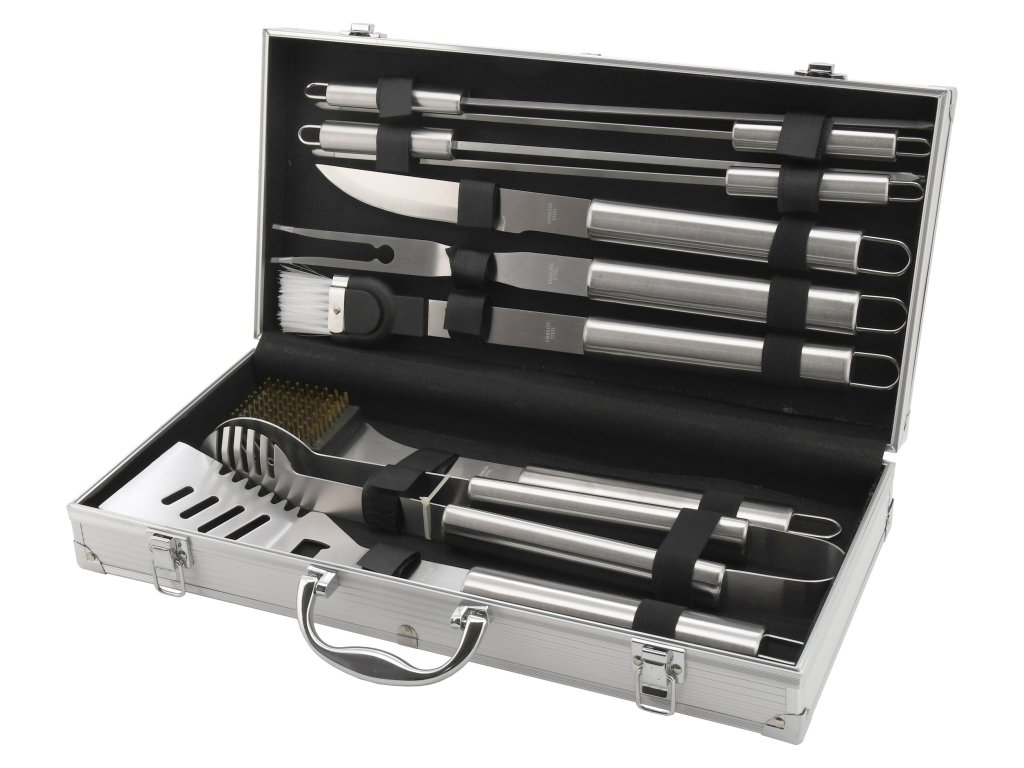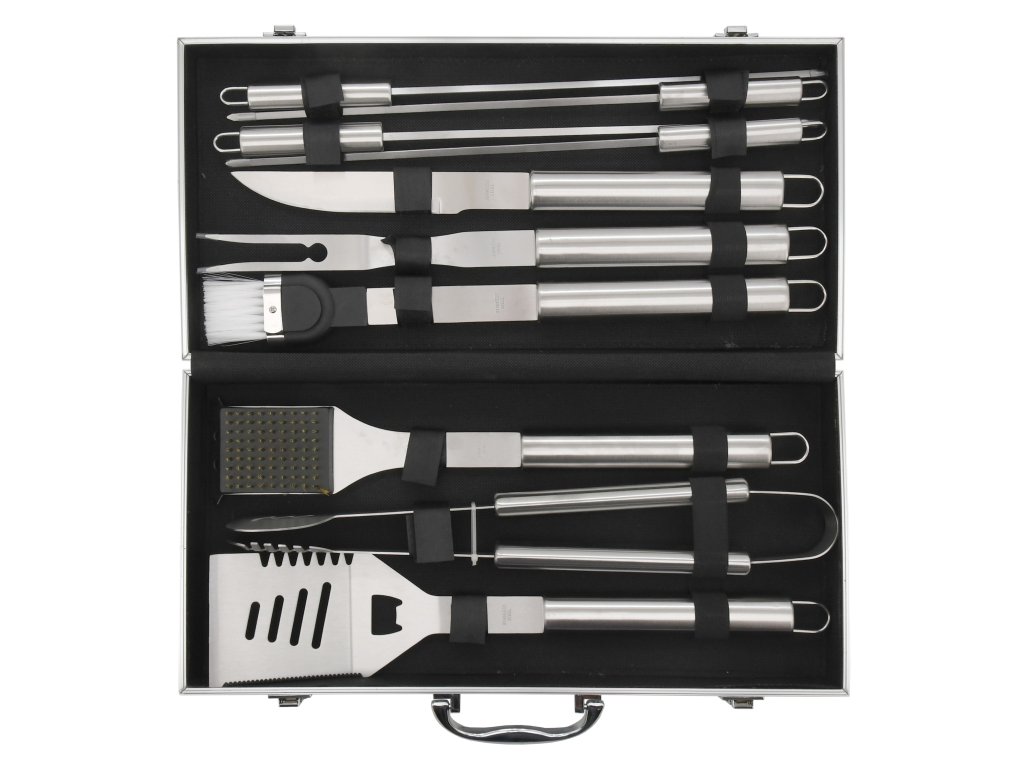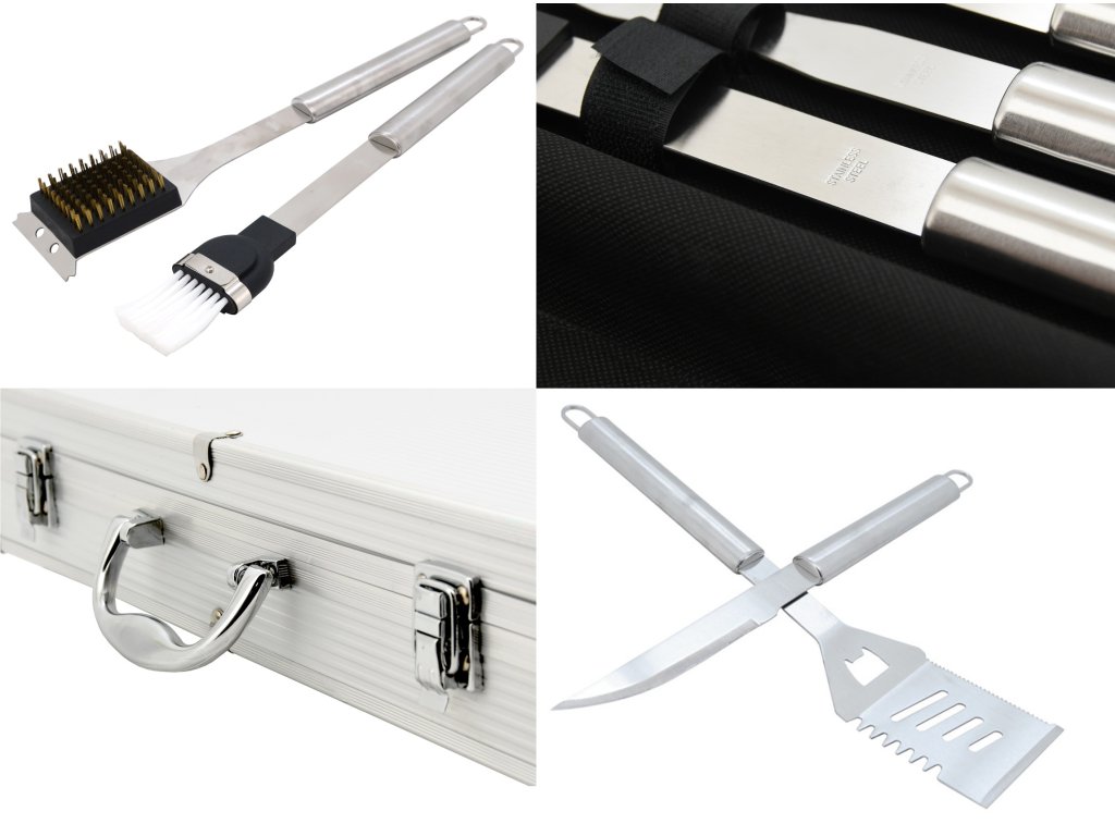 V sadě se nachází obracečka s precizně zabroušenou hranou vybavená zoubkovaným ostřím, otvírákem zátek a otvory pro odtok. Kleště, speciálně tvarované pro jistý úchop nejrůznějších pokrmů, kartáč pro údržbu grilu, kdy samotná kartáčová část je z mosazi. Nepostradatelnou částí grilovcího nářadí je i dvouzubá vidlička, štětec se štětinami z nylonu, pro potírání, či mašlování pokrmů, porcovací nůž a 4x grilovací jehlice s hroty broušenými do špičky.