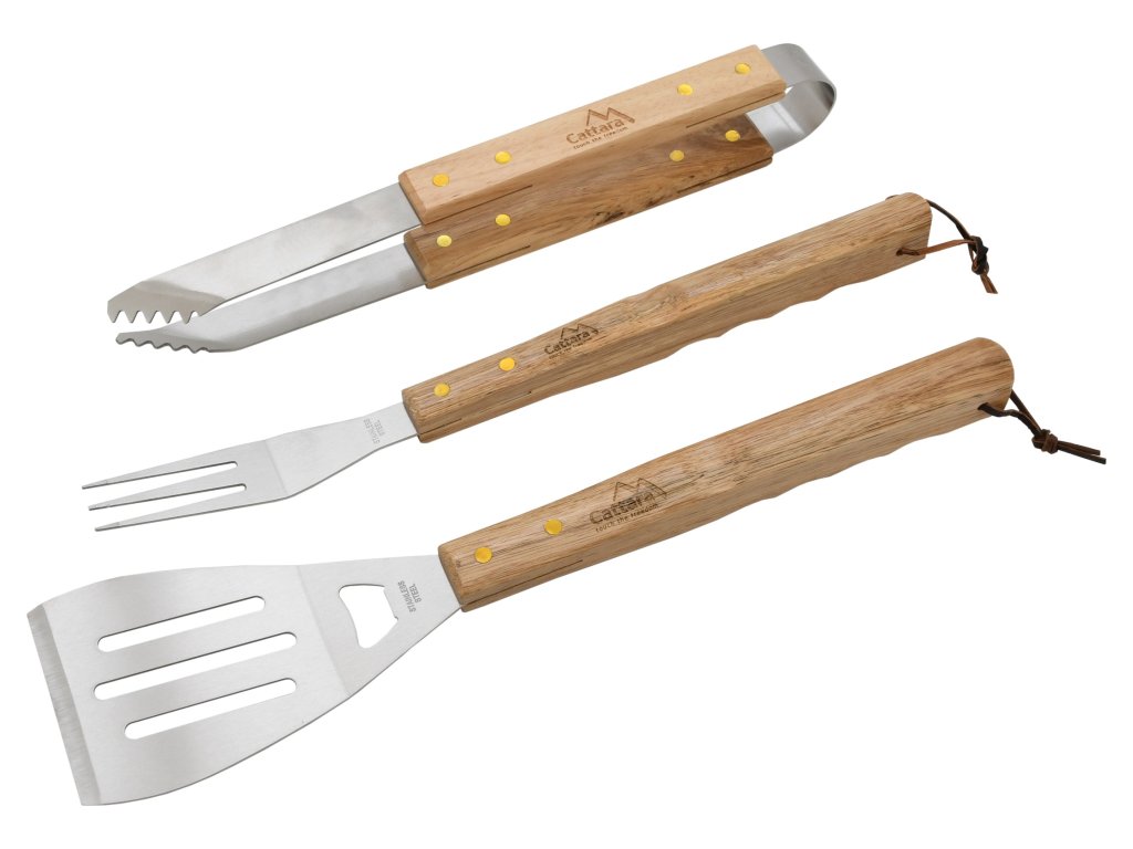 Sada nářadí pro grilování, skládající se z obracečky, vidličky a kleští.