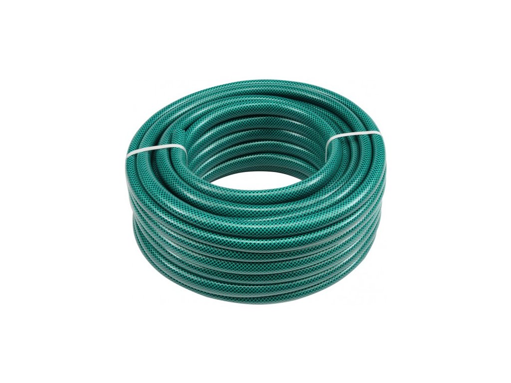 Třívrstvá zahradní hadice z pružného plastu a polyesterovým, příčným opletem. Odolná vůči stárnutí a usazování nečistot. Hadice je pružná i při nízkých teplotách.