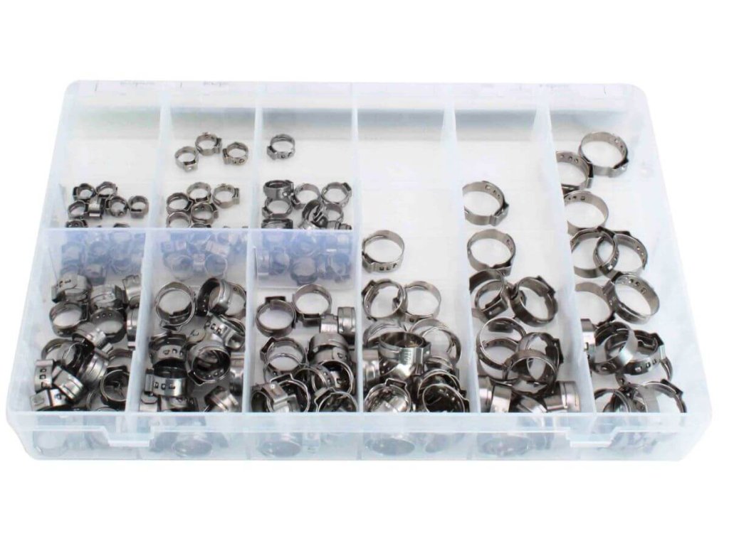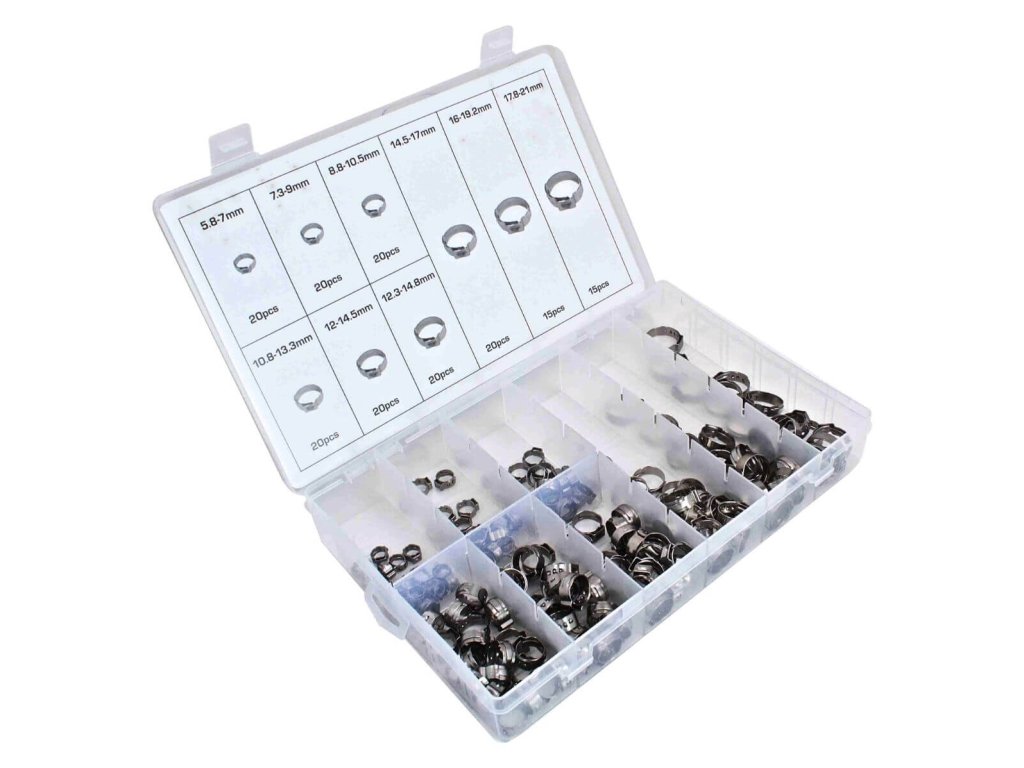 Souprava jednoduchých spon na hadice s tzv. zacvakávacím zámečkem, sada 170 kusů v plastové krabičce – ASTA A-TC016