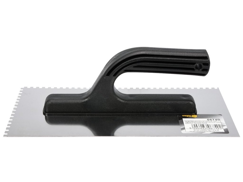 Nerezová omítací stěrka 125x270 mm se zuby 4x4 mm. Plastová rukojeťDoplňkové parametry