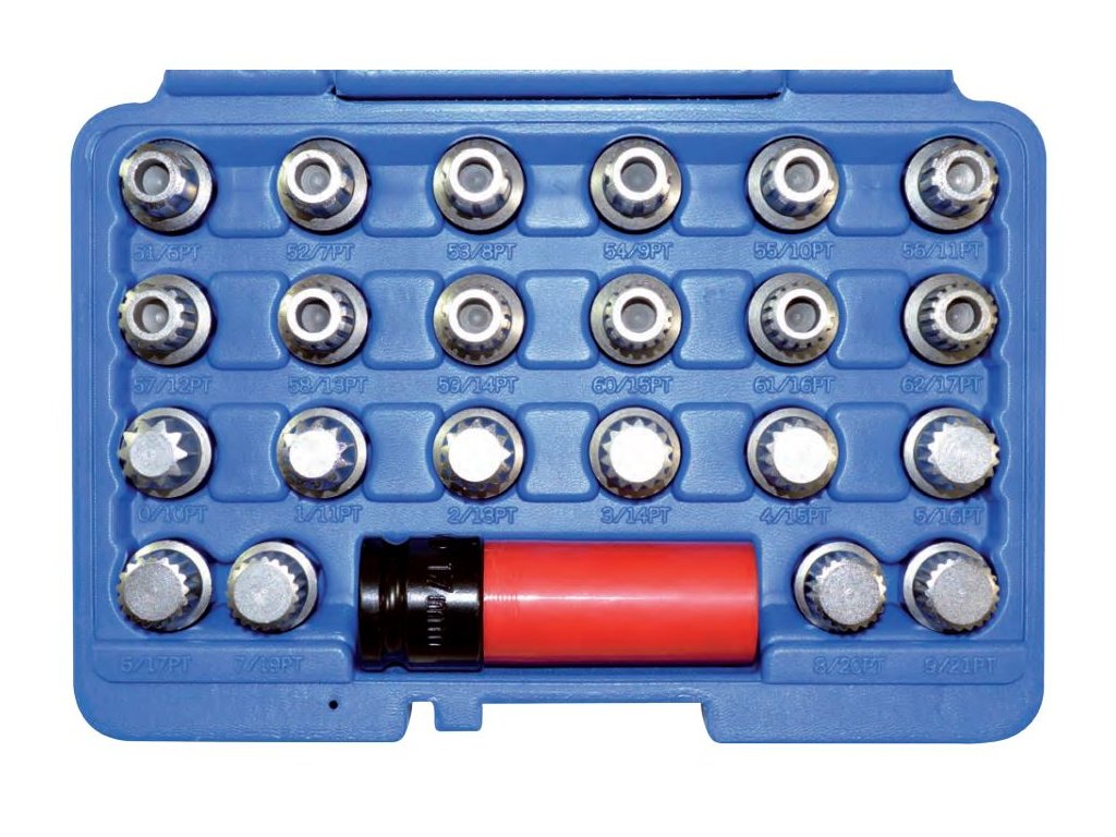 Sada hlavic, tzv. ořechů, na montáž a demontáž bezpečnostních šroubů kol vozidel koncernu Volkswagen (VAG), 23 dílů v plastové kazetě – Kunzer 7FSA23 Speciální adaptéry - klíče na nedestruktivní povolení a utažení kolových šroubů pro případy, kdy nejsou k dispozici tovární hlavice. Určeno pro vozidla Volkswagen Polo, Beetle, Golf, Jetta, Scirocco, Passat, Sharan, Touran a Tiguan do roku výstavby 2010.Doplňkové parametry