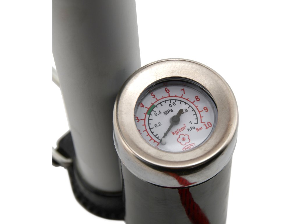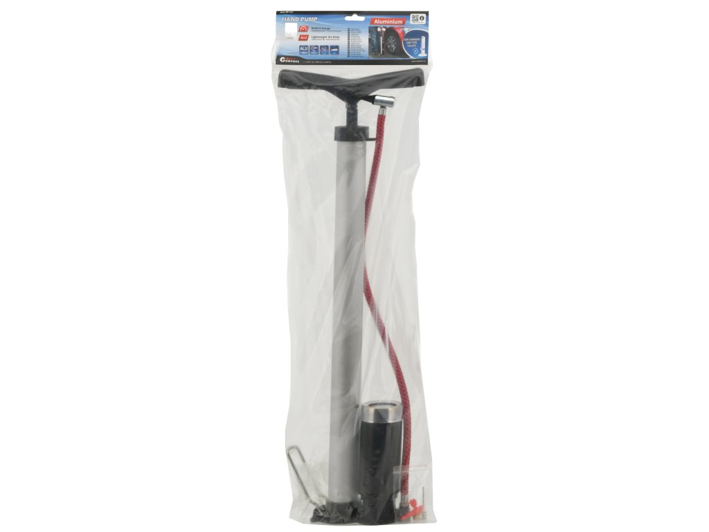 Ruční hustilka s manometrem, vhodná pro huštění pneumatik osobních automobilů, jízdních kol a dalšího příslušenství díky přiloženým adaptérům.