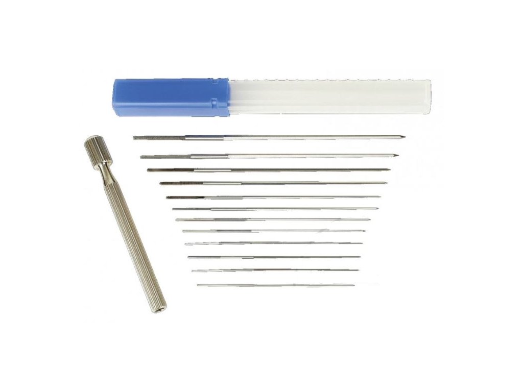 Jehly, tzv. výstružníky, na čištění ucpaných či zanešených trysek karburátorů a jiných malých otvorů, v plastovém pouzdře – JMP 614.03.45 Kuželovitý tvar pracovní části pro lepší výsledek. Rukojeť se 4hranným držákem umožňuje pohodlnou práci – jehly se snadno vyměňují. Kvalitní produkt: vyrobeno z nástrojové oceli, indukčně kaleno. Sada 12 dílů obsahuje: 1x kovový držák, poniklovaný 11x jehla, průměry: 0,60 - 0,65 - 0,70 - 0,80 - 0,85 - 0,90 - 1,00 - 1,30 - 1,50 - 1,70 - 1,90 mmDoplňkové parametry