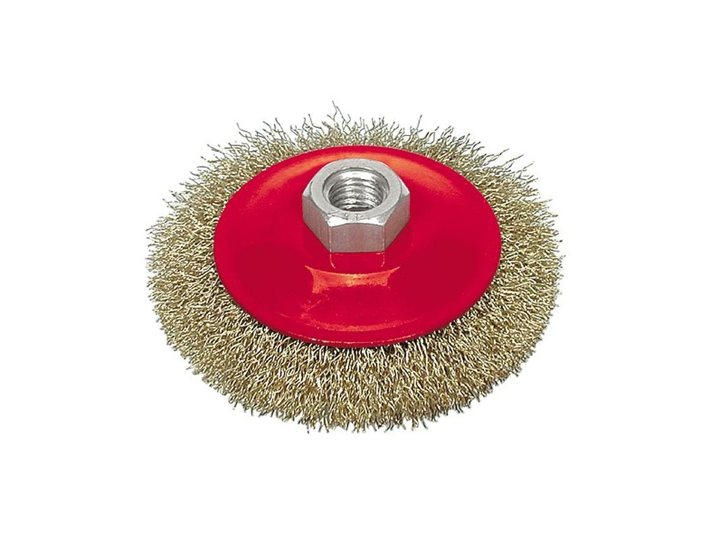 Kartáč kotoučový pro úhlové brusky, zhotovení pomosazený ocelový drát vlnitý.