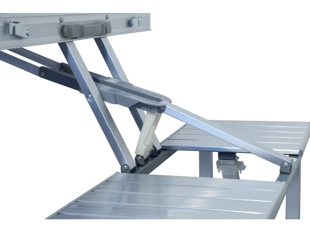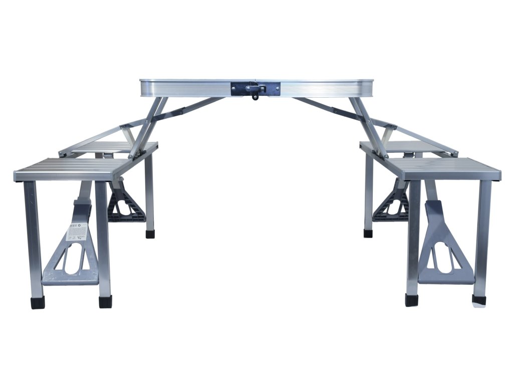 Jednotlivé rozkládací části jsou opatřeny jistícím mechnaismem, bránícím nechtěnnému složení. Zhotovení z hliníku a odolných plastových jistících částí nabízí stabilní posezení s nosností stolu 20 kg a nosností žídliček 100 kg. Umakartová deska stolu je opatřena středovým otvorem, který lze použít spolu se slunečníkem (není součástí).