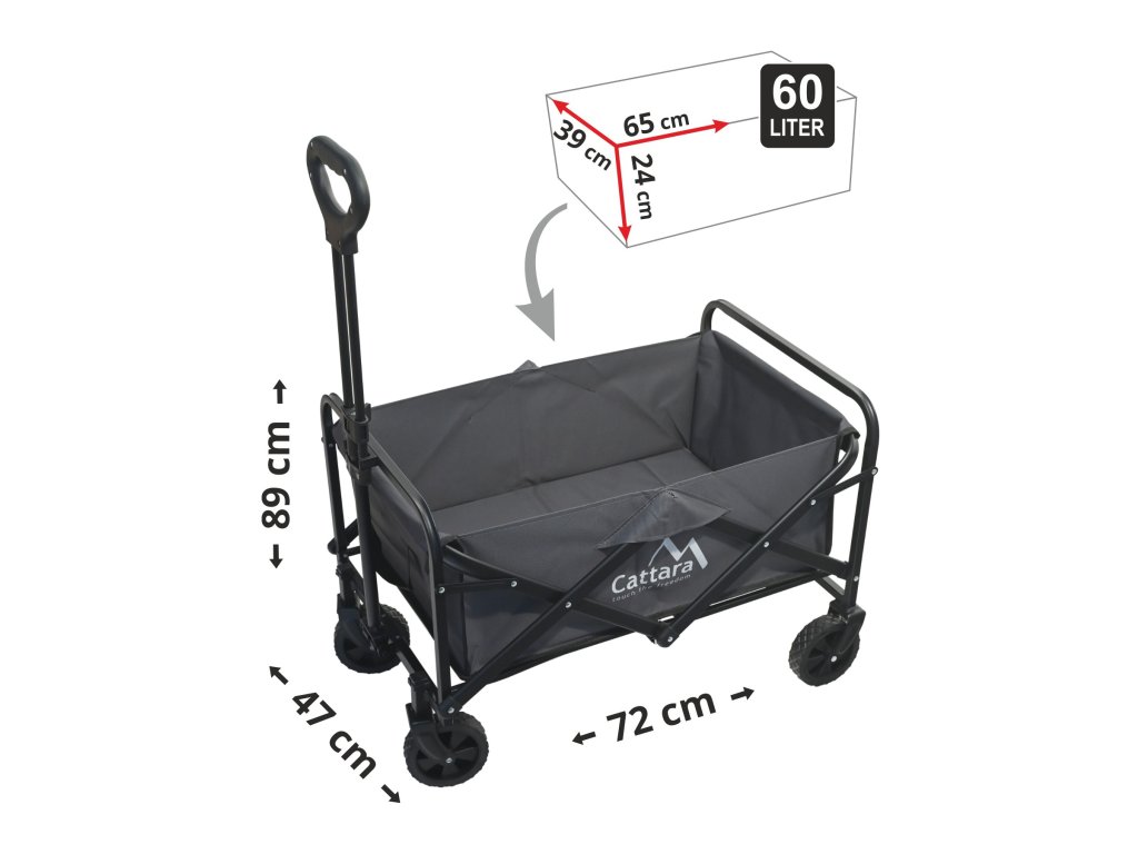 Celkové rozměry vozíku 72 x 47 x 89 cm a ve složeném stavu 49 x 65 x 13 cm, s váhou 6,6 kg. Nákladový prostor je objemný a díky své konstrukci je možné naložit mnohem více věcí, až do povolené nosnosti. Čelní strana korby vozíku je opatřena dvěma sítěnými kapsami na lahve s pitím, či opalovací krémy apod.