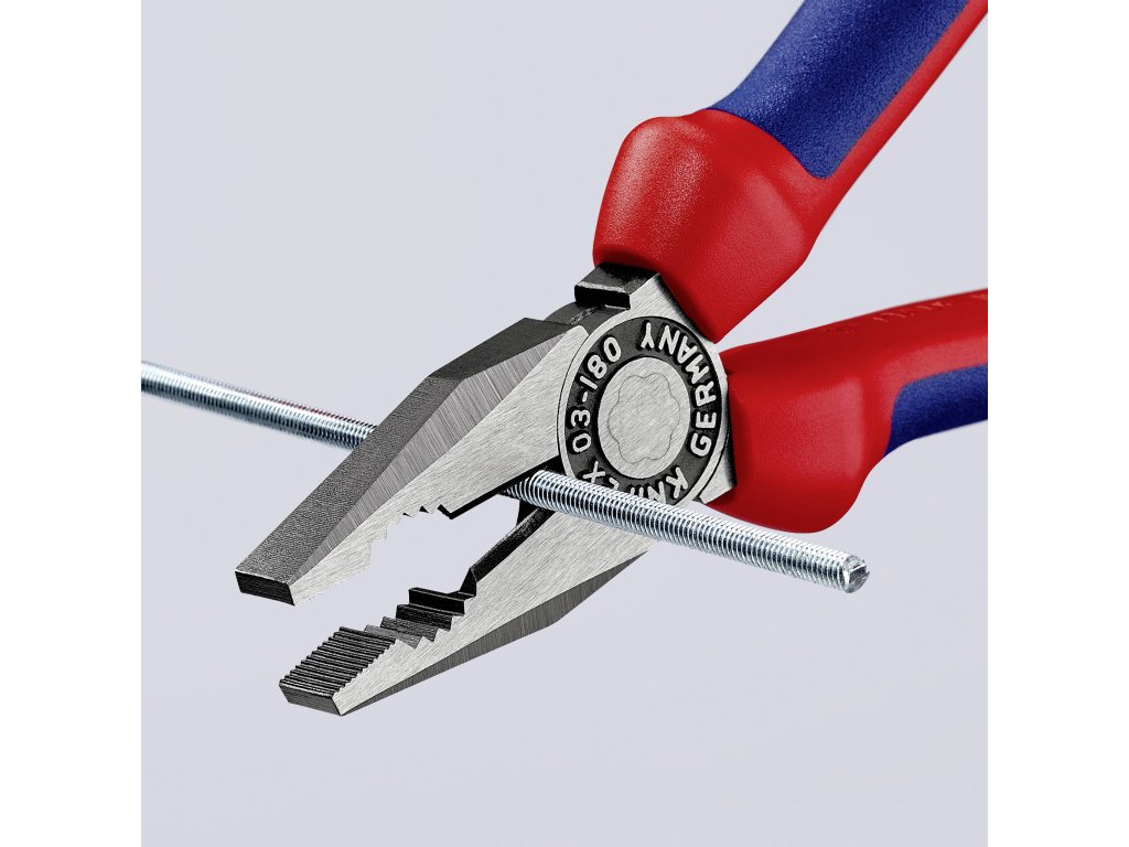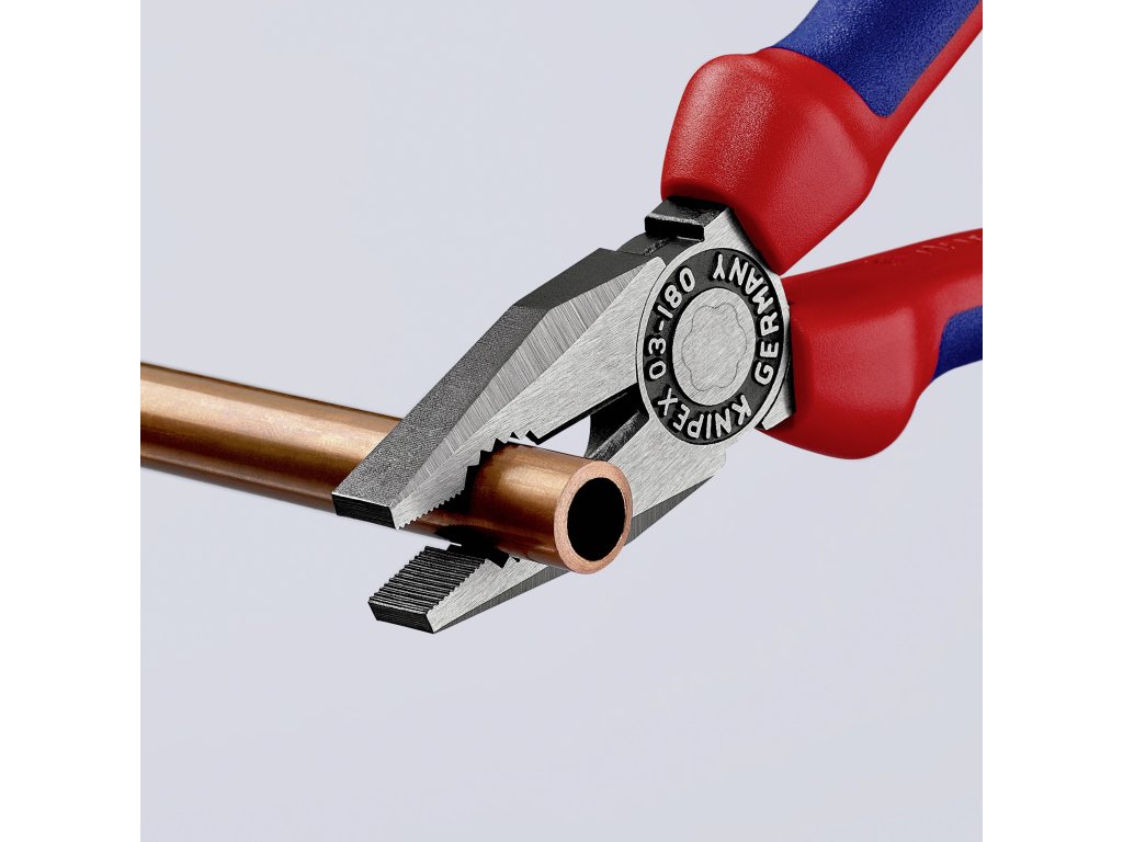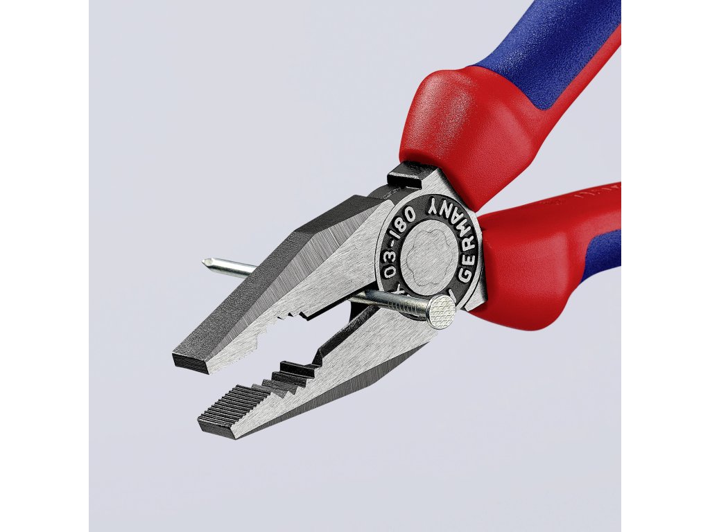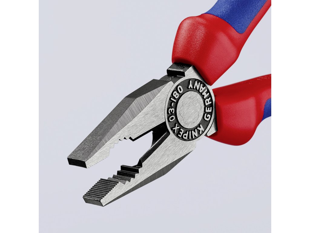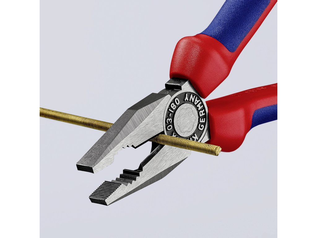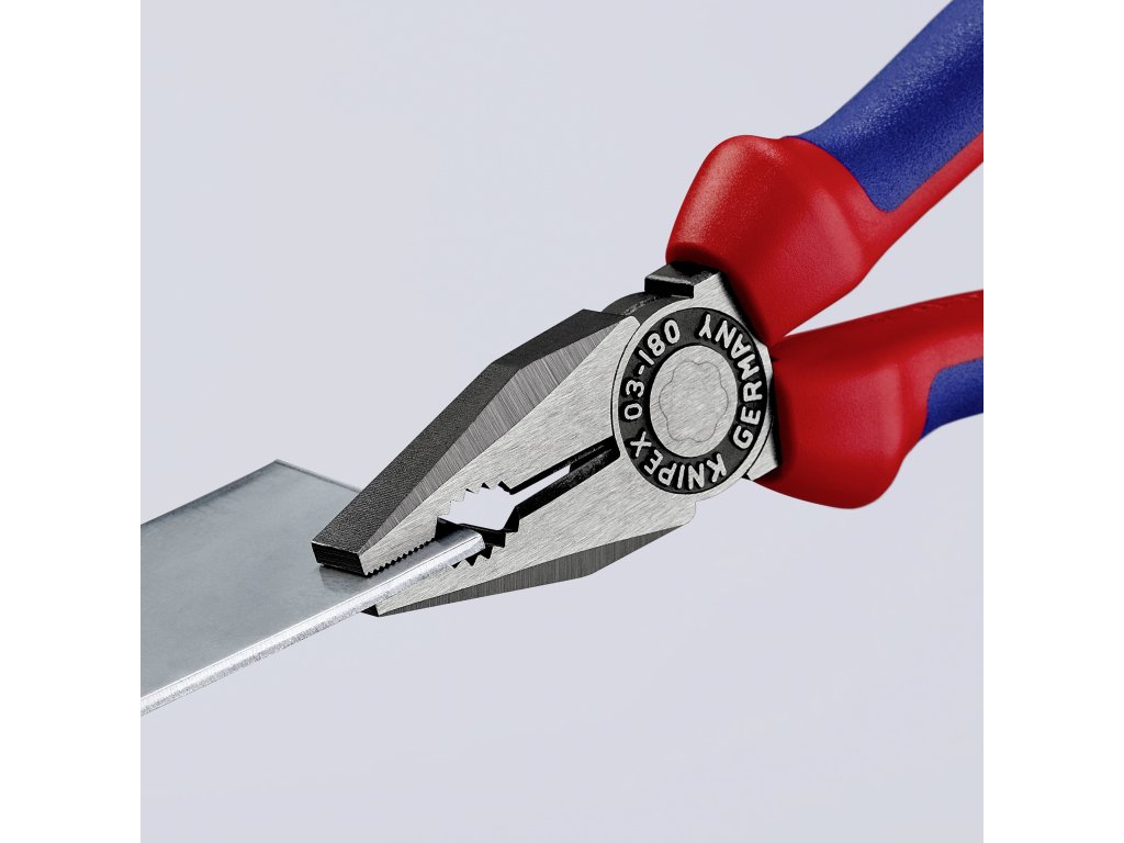 Kombinované kleště („kombinačky“), přecvakávání vodičů až 16 mm^2, délka 18 cm, PVC rukojeti – KNIPEX 03 02 180