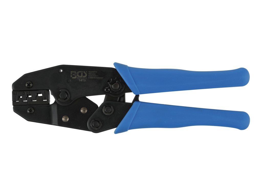 Kleště na konektory (koncovky), krimpovací (lisovací), elektrikářské, ráčnové – s aretací, určeno pro neizolované otevřené a vidličkové konektory – BGS 1419.